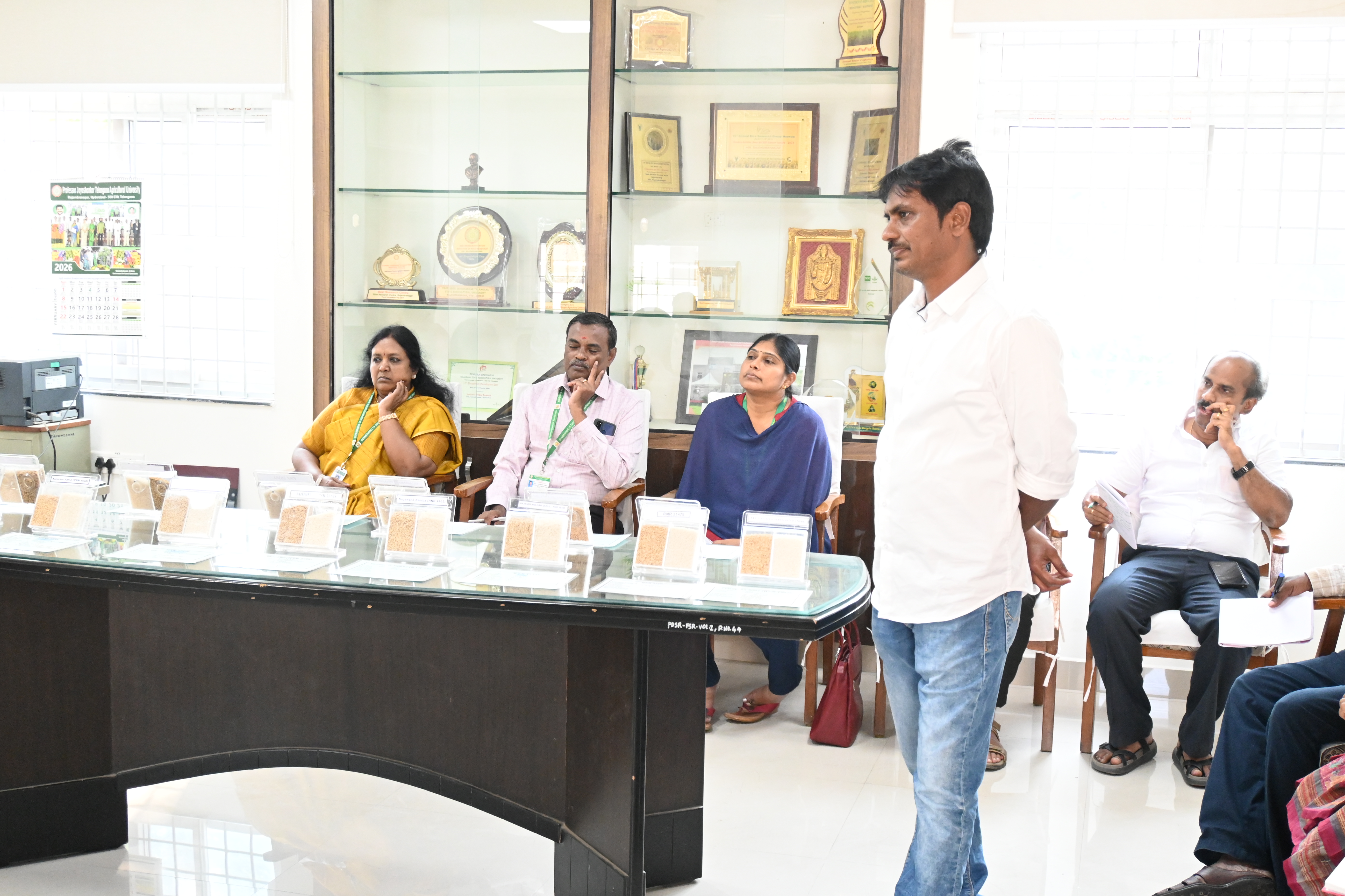 Officials from the Department of Seed Certification and Organic Certification, Tamilnadu, visited Maize and Rice Research Institutes on 24 th February 2026. Dr. M. V. Nagesh Kumar, Director (Seeds), elaborated on the university’s seed production systems, varietal and hybrid commercialization strategies, and mechanisms for ensuring genetic purity and quality assurance. Dr. Y. Chandra Mohan, Director, ARI, highlighted the major achievements in maize and rice research, including the development and release of improved rice varieties and high-yielding maize hybrids tailored to diverse agro-ecologies. Dr. Sridhar Siddi, Senior Scientist (Pl. Br) explained about the PJTAU released varieties of paddy and Dr. D. Sravani, Scientist (Pl.Br) highlighted the yield potential and adaptability of recently released maize hybrids DHM 206, DHM 182, DHM 211, DHM 213 & DHM 218. The team of officials emphasized that RNR 15048 and KNM 1638 spread in lakhs of acres in Tamilnadu. The team interacted with scientists of maize and rice research programmes to understand advanced breeding, hybrid development, and quality seed production technologies. They visited experimental fields, seed production plots, and research facilities to observe varietal evaluation and seed management practices. Scientists explained modern approaches for improving productivity and maintaining seed quality. The visit strengthened technical knowledge, promoted institutional collaboration, and facilitated exchange of expertise in maize and rice research and seed certification systems effectively and sustainably. The visits promote capacity building and support the development of robust seed systems to enhance agricultural productivity and sustainability.