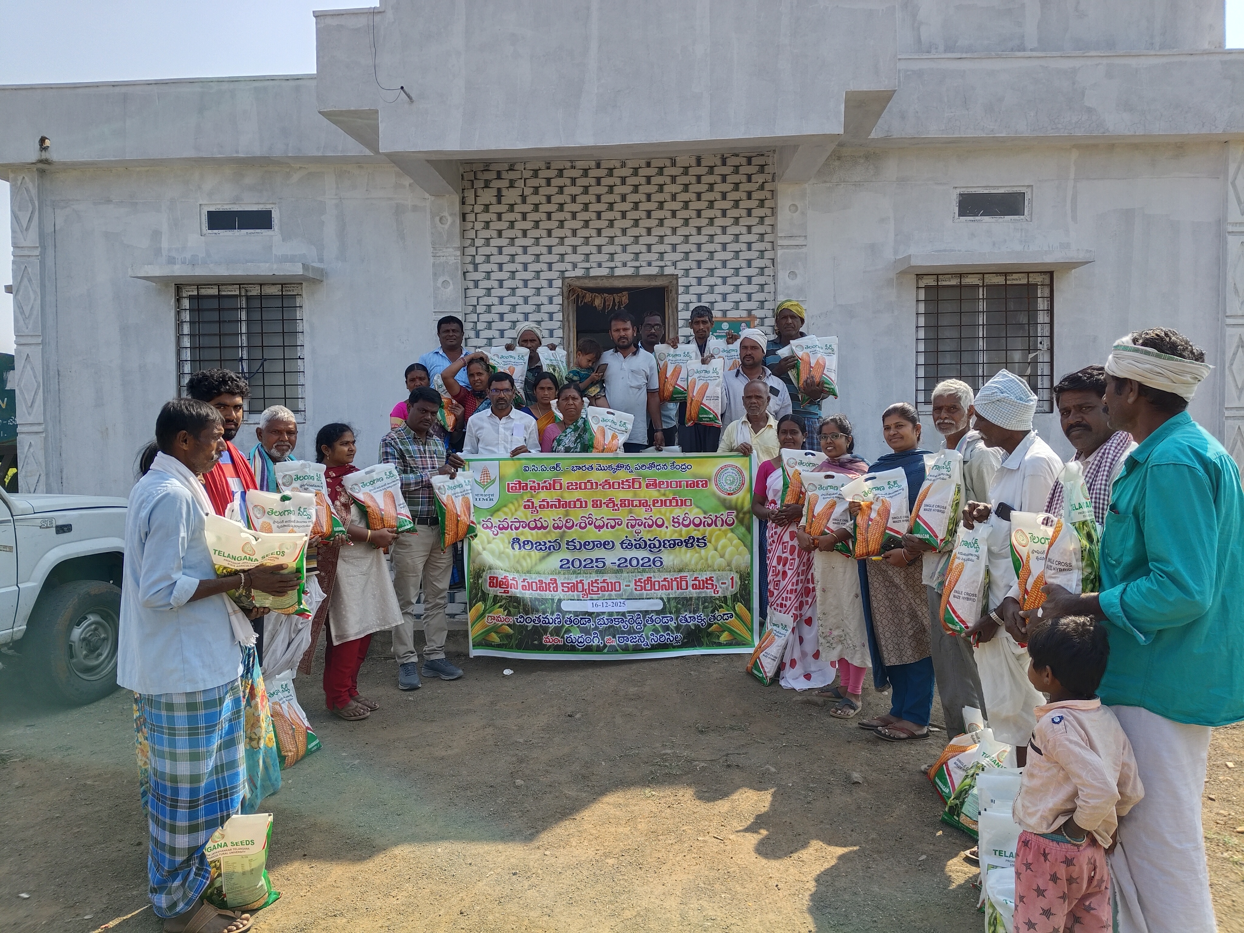 Agricultural Research Station, Karimnagar organized a Farmer Scientist interaction on “Production Technologies in Rabi maize and distribution of maize seed under Tribal Sub Plan (TSP) was taken up on 16-12-2025 at Chinthaman Thanda of Manala Village, Rudrangi Mandal, Rajanna siricilla District. At the outset, Dr. E. Umarani, Scientist (Pl. Br.), ARS, Karimnagar has welcomed gathering and briefed about the research activities carried out at ARS,, Karimnagar and enlisted the suitable hybrids for rabi maize cultivation. Later she also explained about the objectives of the TSP programme. Further, a farmer scientist interaction was conducted. Followed by, Dr. E. Rajanikanth, Scientist (Agro.), ARS, Karimnagar has explained in detailed about the queries raised by the farmers. He also emphasized about the weed management, fertilizer management aspects of rabi maize and also focused on problems and perceptive of zero tillage maize cultivation. Later, Dr. G. Usharani, Scientist (Pl. Br.) ARS, Karimnagar gave brief note importance of crop diversification, cultivation of specialty corns as means to generate additional income and management of fall army warm during rabi season. Followed by Sri. G. Thirupathi a progressive farmer from Chinthaman Thanda shared his experiences about the cultivation of Karimnagar Makka-1 hybrid. Later, distribution of Hybrid Maize seed was taken up to the Tribal farmers of Manala revenue village. Smt. Priyadarshini, MAO, Rudrangi, Sri Venkatesh, AEO, Manala, Smt, D. Padma, AO, ARS, Karimnagar, Sri. Vamshi, AEO, Karimnagar and around 52 tribal farmers from Manala were attended the programme. The programme was ended with the vote of thanks proposed by Dr. E. Umarani, Scientist (Pl. Br.), ARS, Karimnagar.