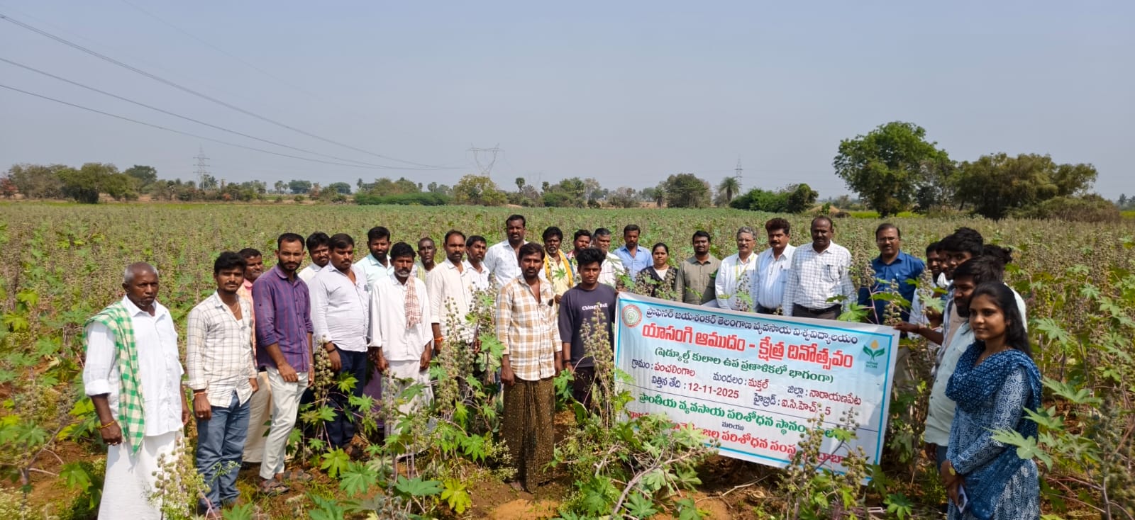 To enhance the area under rabi castor cultivation, the AICRP on Castor team at RARS, Palem has conducted 50 demonstrations in farmers’ fields under the Scheduled Caste Sub-Plan (SC-SP). These demonstrations focused on the adoption of improved production technologies particularly high-yielding cultivars to improve productivity and profitability. In this context, a field day was organized at the farm of Sri Anjaneyulu in Panchalingala village, Makthal mandal, Narayanpet district where the improved castor cultivar ICH-5 was demonstrated. The programme was organized by a team of scientists from AICRP on Castor, RARS, Palem comprising Dr. K. Sadaiah, Scientist (Plant Breeding), Dr. G. Eswara Reddy, Scientist (Plant Breeding), and Dr. V. Divya Rani, Scientist (Plant Pathology) under the chairmanship of Dr. M. Sreedhar, Principal Scientist (Oilseeds). The event was also attended by scientists from the ICAR-Indian Institute of Oilseeds Research (ICAR-IIOR), Hyderabad, including Dr. V. Dinesh Kumar, Principal Scientist (Biotechnology), Dr. Senthilvel Senapathy, Principal Scientist (Plant Breeding) and Dr. T. Manjunatha, Senior Scientist (Plant Breeding). At the outset, Dr. K. Sadaiah highlighted the importance of the programme and emphasized the need to expand castor cultivation in the state. The host farmer Sri Anjaneyulu, shared his experiences and the crop management practices he adopted to raise a healthy crop. This was followed by an interactive session in which farmers raised queries regarding pest and disease management as well as marketing opportunities. Later, Dr. G. Eswara Reddy elaborated on good agricultural practices for achieving higher yields in castor. Dr. V. Divya Rani discussed effective pest and disease management strategies in castor. Dr. M. Sreedhar has emphasized the importance of reintroducing traditional crops in the region and stressed the need for crop diversification. Subsequently, Dr. T. Manjunatha explained the varietal characteristics of ICH-5 and detailed important agronomic practices such as optimum spacing and suitable sowing time. Dr. Senthilvel Senapathy spoke about the latest technologies for managing biotic stresses in castor. Dr. V. Dinesh Kumar educated farmers on advanced technologies developed by ICAR-IIOR, including high-density planting, application of growth retardants, seed treatment with Trichoderma and the use of biopolymers. Agricultural Extension Officers (AEOs) Sri Vijay and Vyshnavi also interacted with farmers and discussed challenges faced in cultivating crops such as cowpea, chilli and tomato with the group of scientists. Scientists addressed the queries raised by both farmers and Department of Agriculture officials. The programme concluded with a field visit to the ICH-5 castor demonstration plot, where farmers closely observed the crop and engaged in detailed discussions on its varietal characteristics, overall performance, and effective pest management practices with scientists.