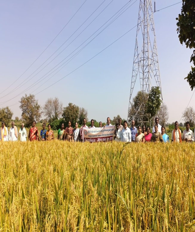 A field day was organised on “Direct seeded rice” by Village Adoption Programme team of scientists, College of Agriculture, Rajendranagar in Atheli MallaReddy paddy field the Adopted village, Guduru, on 17-11-2022 to create awareness among farming community. The programme was conducted under the guidance of VAP Chairman and the Associate Dean Dr. C. Narendra Reddy emphasized the importance and advantages of DSR that it is labour saving, less drudgery, water saving and the crop maturing 7-10 days early than the regular rice growing method, also the cost of production being low all the farmers were asked to follow the DSR Technology. Convenor Dr. T. Ramesh, Sr. Professor and Head, Crop Physiology has suggested the farmers should be early adopters in using the updated technology and taking guidance from University and State Dept. officials. Dr. K. Sumalini from College of Agriculture Associate Professor (Genetics and Plant Breeding) has given brief insights about the importance of the programme and explained that for this broadcasting method of sowing, the characters of rice variety should be early emergency of seedling, culm should be strong, early duration varieties to be selected. Weed management is the major aspect in DSR which can be controlled at different stages and pre and post emergence weedicides are available. Also explained that in Telangana state medium and early duration varieties are suitable for broadcasting. Dr Y. Samatha Parameshwari, Department of Agronomy, has explained the crop management aspects right from sowing to harvesting stage in DSR. Dr.M.Venkateswara Reddy created awareness on vegetables crop like tomato, brinjal, onion and leafy vegetables and flower crops like marigold which will have a good demand and which can be grown during the rabi season. Mandal Agricultural Officer Sri. Gopal attended the training programme and has explained that all the farmers should take inspiration from Atheli MallaReddy who has followed University recommendations from time to time and adopted DSR. Adopted village team members Dr. K. Shailaja, Department of SSAC, Dr. K. Aruna, Department of Agricultural Extension, Dr. I Shakuntala Devi, Agricultural Economics, Guduru Village Deputy Sarpanch, Sri. Uppala Dayanand, AEO Mrs. K. Anitha of Agriculture department along with 50 farmers.