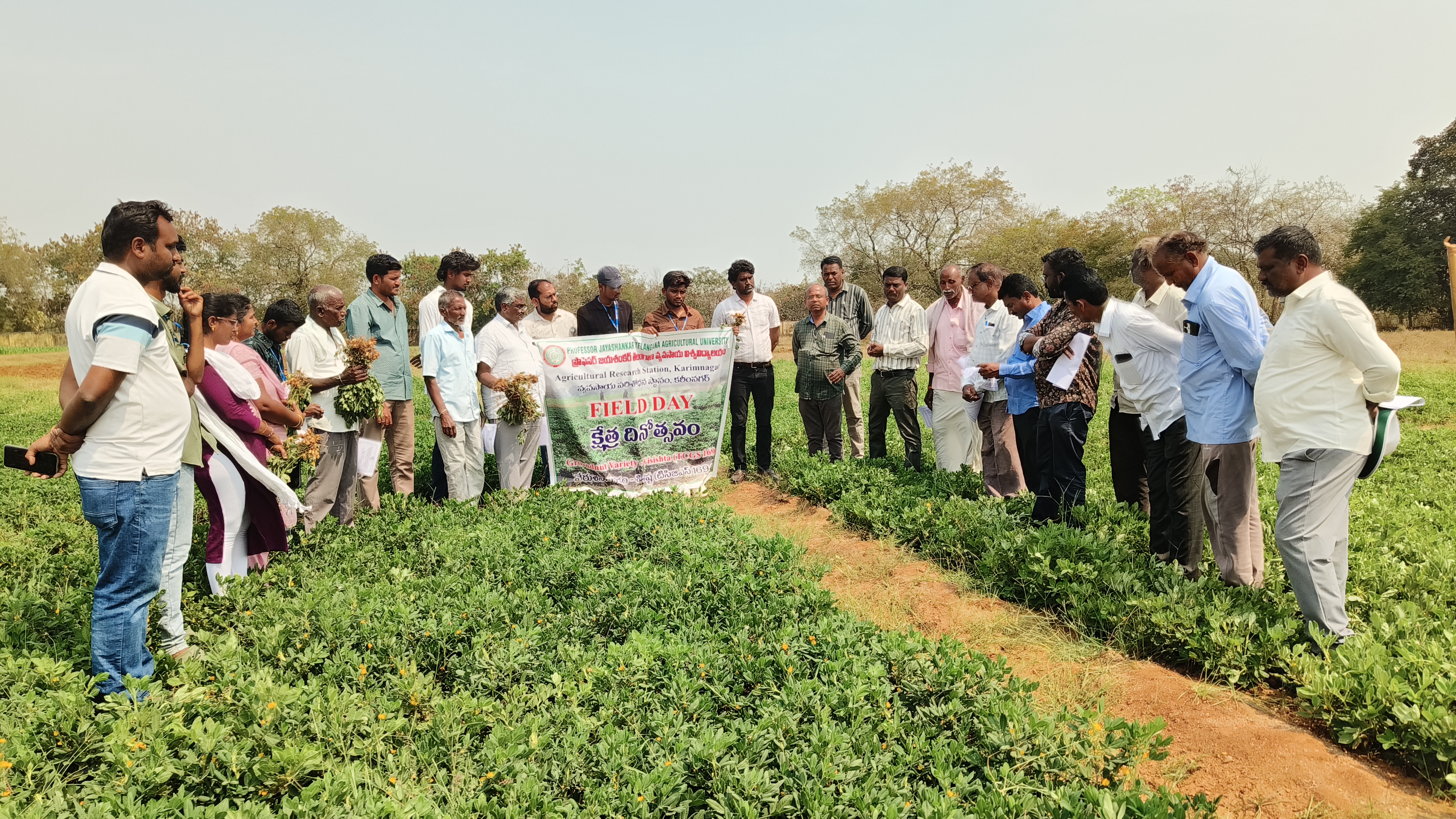A field day on the groundnut variety Visistha (TCGS-1694) was organized by the Agricultural Research Station, Karimnagar on 27-02-2026 at its campus. During the programme, Dr. B. Ramprasad, Principal Scientist (Entomology) and Head, ARS, Karimnagar, explained the major insect pests of groundnut such as leaf miner, tobacco caterpillar, aphids, thrips, and root grub, along with their integrated pest management practices. He also highlighted the role of micronutrients in improving groundnut productivity. Dr. E. Rajanikanth, Scientist (Agronomy), elaborated on the varietal characteristics of Visistha, groundnut crop management practices, and the scope for cultivating alternative crops to rice during the rabi season under crop diversification. He discussed the performance of the groundnut variety Visistha and highlighted its suitability for rabi cultivation under local agro-climatic conditions and also emphasized the importance of gypsum application @ 500 kg/ha at the pegging stage for better pod development. Dr. B. Harikrishna, Coordinator, TRVK, Karimnagar, discussed the superior performance of the Visistha variety based on the feedback received from farmers who participated in the Front-Line Demonstrations (FLDs) conducted by TRVK, Karimnagar and also emphasized about the importance of oilseed production in Telangana. The programme was also attended by Dr. G. Usharani, Scientist (Plant Breeding), Dr. E. Umarani, Scientist (Plant Breeding), Dr. K. Madan Mohan Reddy, Scientist (TOT), and Dr. M. Rajendraprasad, Scientist (CP). An interactive session was held in which farmers raised various issues related to groundnut cultivation, and the scientists provided appropriate technical recommendations. Overall, the programme was attended by 25 farmers from Karimnagar district and was found to be informative and useful for promoting rabi groundnut cultivation under local conditions.