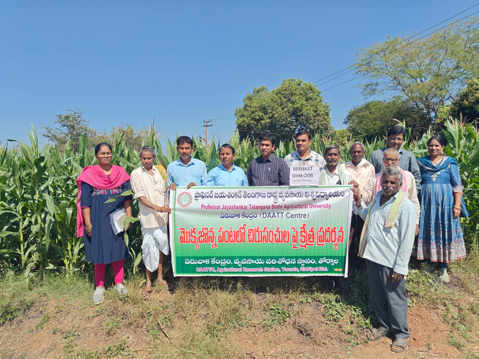 DAATTC, Tornala has organized field day of Maize minikit DHM-206 vs DHM-121 at Husnabad (V&M) in Nemalikonda Ilaiah farmer field of Husnabad (V&M), Siddipet District. Dr. M. V. Nagesh kumar, Principal Scientist (Maize) & Head observed growth performance and other parameters of the minikits. Later, they interacted with farmers to know the farmers preference as well as performance of minikits. Dr. D. Bhadru, Pricipal Scientist, Dr. B. Mallaiah, Sr. Scientist, Dr. K. Vanisri, Scientist, MRC, Rajendranagar, Sri J. Vijay, Coordinator & Dr. Ch. Pallavi, Scientist, DAATTC, Tornala, MAO Nagaraju and 25 farmers have participated in this visit.