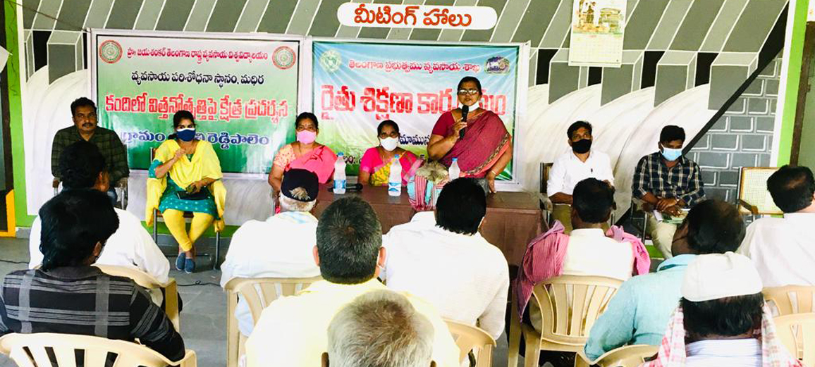 Agricultural Research Station, Madhira organized field day on seed production of Redgram variety Warangal Kandi-1 (WRGE-97) at Buchireddypalem (village),Errupalem (M) during Vanakalam,2021. Dr.K.Rukmini Devi, Senior scientist (Br.) & Head has chaired this programme and explained about the importance and characters of variety WRGE-97. Dr.S. Srinivasa Rao explained about the fertilizer and weed management in Redgram. After that Smt. K. Naga swathi, Scientist (Ento) has explained about the pest management practices in Redgram. Krishna Reddy and Nageshwar rao, farmers from buchireddypalem were cultivated this variety and shared their experience that WRGE-97 is good variety , having good crop canopy, pod bearing branches with wilt tolerance expecting yield of 8 Q/ acre by timely taken suggestions from the scientists of ARS, Madhira & other farmers of the village were also satisfied with this variety. Scientists of ARS, Madhira, Mandal Agriculture Officer (MAO), AEO of Errupalem mandal and about 30 farmers were participated in this programme.