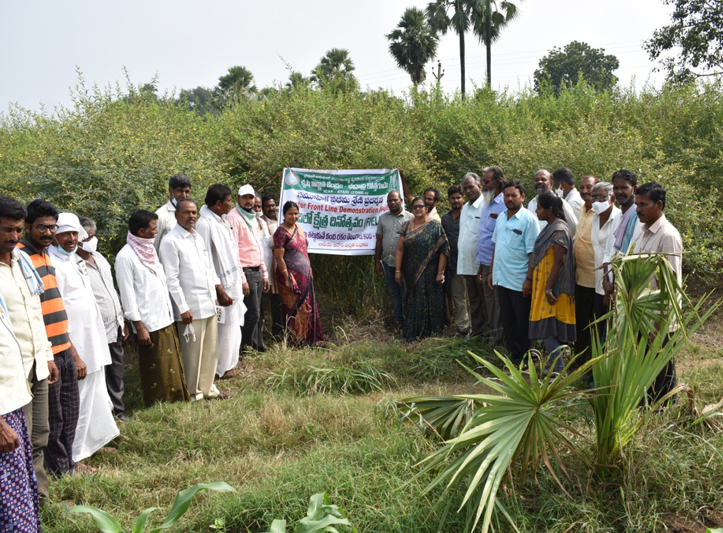 KVK, Bhadradri Kothagudem has conducted a Field day on "Wilt tolerant Redgram var Telangana Kandi-1(WRGE-93)” at Patanjanapuram village, Sujathanagar Mandal. Dr. K. Rumini Devi, Principal scientist (Pulses) and Head, ARS, Madhira has explained about the importance of cultivation of pulse crops in the sustainability of cropping system and advised the farmers to adopt high yielding and disease resistant varieties of increased profitability. Dr. V. L. Narayanamma, Programme Coordinator has explained the activities of KVK and explained the pest management practices to be taken up in Redgram during the flowering and fruiting stage. Dr. R. Vishwatej, SMS(Extension) and explained farmers about the CFLD programme and also interacted with farmers and took their feedback regarding performance of “Telangana Kandi-1 (WRGE-93)” promoted under the programme. Dr. R. Srinivas Rao, SMS (Crop production) has explained about the alternative rabi crops and their ICM practices. Dr. Venugopal, Scientist has suggested farmers about the foliar spray for better grain setting and attaining grain weight Later, all the 52 participant farmers along with Sri. Ravikumar (Sarpanch), Sri Bagam Mohan Rao (RBS member) and Smt. K. Narmada, MAO has visited and observed the performance of the treatment plot i.e “Telangana Kandi-1 (WRGE-93) as against check plots in the village.