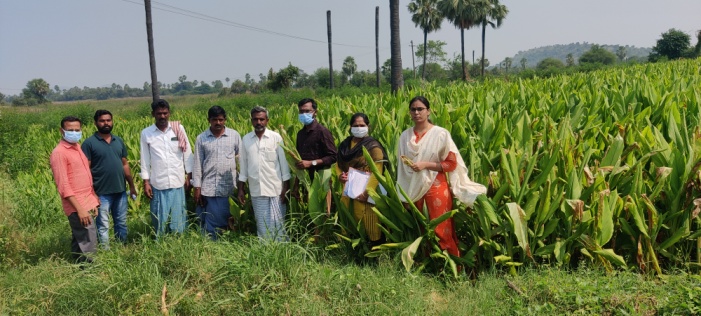 During this field visit observed Rhizome rot in turmeric and recommended spraying of Metalaxyl + Mancozeb @1g/lit (or) drenching of Copper oxy chloride 3 g/lit, observed leaf blotch in turmeric and recommended carbendazim+Mancozeb@2.5g/lit.
