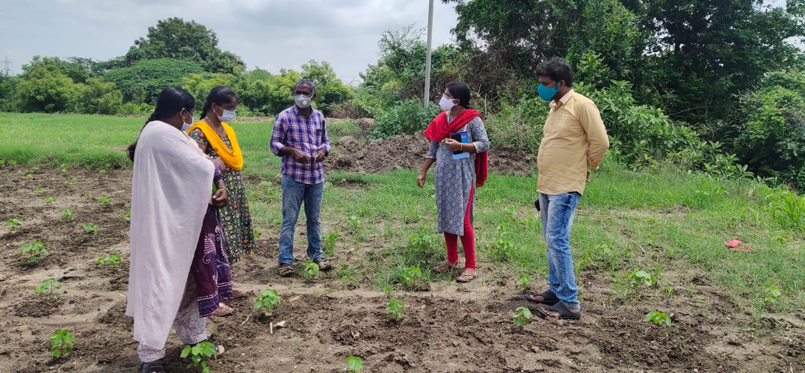 Village adoption team of Agricultural College, Warangal conducted diagnostic field visit and visited paddy minikit fields: WGL-962 and KNM-1638 along with Agricultural officers, Department of Agriculture at Damera village on 17.07.2021. Dr.G.Swathi, Dr.G.Santosh Kumar, Smt. Ch.Yashaswini, Smt. Kota Swetha (MAO) and Smt. Shivaleela (AEO) visited paddy, cotton and redgram fields in the village. In Cotton, sucking pest complex incidence was observed and recommended Acephate @ 1.5g/l or Imidacloprid @ 0.25 ml/lit or diafenthiuron @ 1.25g/l. Paddy minikits are in nursery stage (20 days old) and no pest and disease incidence was observed in paddy and redgram.