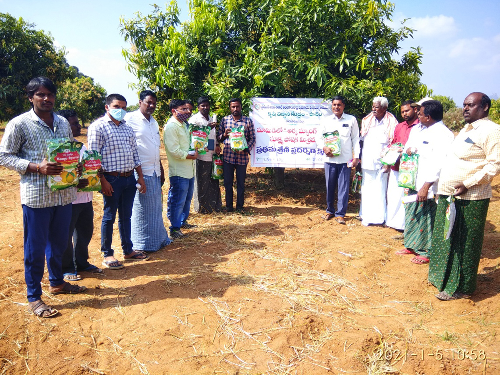 The KVK, Palem has been organised Front line Demonstration on Arka mango special micro nutrient foliar spray in Mango at Chennapurao village, Peddakottapally mandal, Nagarkurnool district, Telangana state on 05.01.2021 to the Mango growers. Dr. Adhi Shankar, SMS (Horticulture), KVK, Palem given training on Integrated crop management in Mango i.e. Selection of varieties, high density planting, pre bearing orchard management, training and pruning techniques, crop regulation, role of micro nutrients and growth harmones, flower and fruit drop control, INM and IPM package of practices, drip and fertigation management and post harvest management explained detail to the farmers. Further, inputs Arka Mango special 4kg, Planofix 100ml each distributed to the 10 selected farmers. He recommended to spray Arka mango special 5g + Multi K 5g + Planofix 0.23 ml per litre twice at peat nut stage and marble stage in Mango to reduce fruit drop and to increase fruit size. Mr. Lakshman, Horticultural officer, Kollapur division explained about formation on farmers producer organisation (FPO) on Mango, Export farmers registration with APEADA, Marketing channels and GAP certification to the farmers. The training programme graced by Sri. N. Vishnuvardhan Reddy, village sarpanch and 25 Mango farmers had participated to this programme.