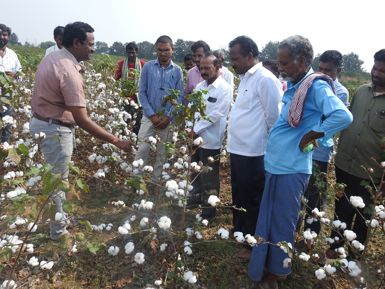 HDPS cotton field demonstration and awareness programme was organized at ARS-DAATTC, Mudhole on 15.12.2022. Dr. G. Veeranna, Principal Scientist (Agro) and Head, ARS-DAATTC, Mudhole explained about HDPS cotton to farmers and enlightened the importance of HDPS cotton in present scenario and provided suggestions to problems expressed by farmers. Later, Dr. K. Vijay Kumar, Scientist (GPBR) explained about different cotton varieties developed by ARS, Mudhole. Dr. D. Karthik, Scientist (ToT), DAATTC, Mudhole, Sri. A. Bhaskar, MAO, Mudhole, Sri. Praveen, AEO (Mudhole) and 18 farmers attended the programme.