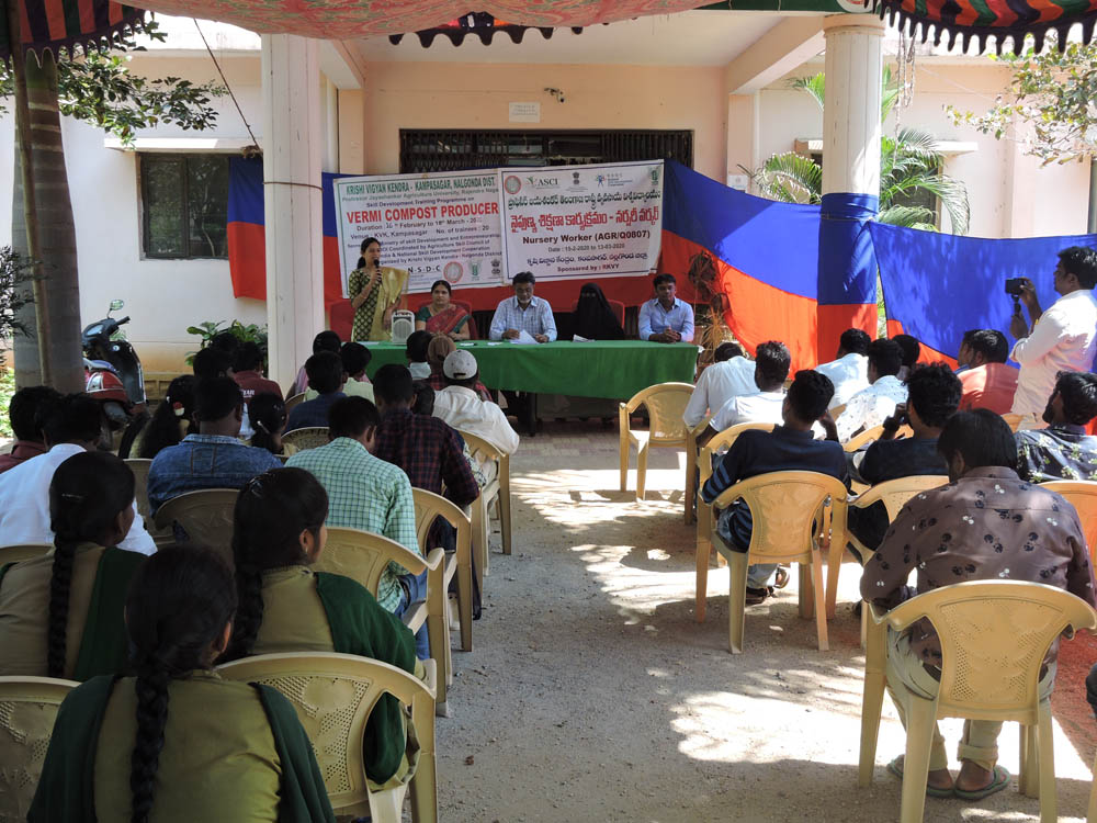 Two Skill Development Training Programmes on Jobroles “Nursery Worker” and “Vermicompost Producer” were inaugurated at KVK, Kampasagar on 15.2.2020. The Training Programmes will be conducted from 15.2.2020 to 18.3.2020 for 25 days to 20 Trainees in each Job Role with support of National Skill Development Corporation (NSDC) and Agriculture Skill Council of India (ASCI) sponsored by Ministry of Skill Development and Entrepreneurship, GOI. Dr. M. A. Aariff Khan, Programme Coordinator, KVK, Kampasagar addressed the Trainees and emphasized on Importance and necessity of establishing commercial Nurseries for vegetable and fruit cropsi and Vermicompost Production units in Nalgonda District and advised the trainees to develop sucessful Enterprenuers by utilizing the training programme effectively. Dr.Hameedunnisa Begum, Principal Sceintist (Horticulture), Horticultural Research Station, Aswaraopet, SKLTSHU as Guest of Honour adressed the Trainees and discussed about various commercial methods of Propagation of Horticultural crops and importance of Nursery raising in present Scenario. T.Himabindu, SMS (Horticulture) and Dr.T.Bharat SMS (Crop Production) briefed about the training programme outline, technial sessions and practicals involvement, Exposure visits on respective jobroles. Dr.K.Sumalini, Vice Principal, APT, Kampasagar and other KVK Sceintists present on the ocassion.