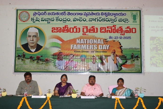 KVK, Palem, in collaboration with RARS, Palem, organized National Farmers’ Day (Kisan Diwas) at the RARS premises, Palem (V), Bijinepally (M), Nagarkurnool (D) on 23.12.2025. The programme commenced with welcoming the dignitaries to the dais by Dr. P. Prashanth, SMS (Agricultural Extension), KVK, Palem, followed by the lighting of the lamp and the Telangana State and PJTAU University song. On this occasion, Dr. L. Krishna, Associate Director of Research, STZ, delivered the welcome address and extended greetings to farmers from the Southern Telangana Zone, particularly Nagarkurnool, Nalgonda, Miryalaguda, Vikarabad, and Mahabubnagar districts. He highlighted the significance of Kisan Diwas, commemorating Sri. Chaudhary Charan Singh, former Prime Minister of India, for his immense contributions to the farming community and for initiating institutions like NABARD aimed at farmers’ welfare. He further emphasized the varieties released by PJTAU, highlighting RNR 15048 for its local and global importance. The key role of RARS, Palem in conducting research on major crops such as redgram, sorghum, castor, millets, and groundnut, and in developing location-specific varieties was stressed. Recent advancements like RMS and QSEV and their impact on the state were discussed, along with the growing importance of robotics, IoT, drones, and artificial intelligence in agriculture. Dr. B. Pushpavathi, Associate Dean, Agriculture College, Palem, emphasized the need for farm mechanization to address labour shortages and advised farmers to adopt appropriate, location-specific machinery. She encouraged farmers to be innovative and skill-oriented in farming, marketing, branding, and export activities. Dr. P. Sreedevi, Programme Coordinator, KVK, Palem, highlighted the pivotal role of KVKs in technology transfer, reaching unreached farmers, district crop profiles, and crop diversification and stressed the importance of dietary diversity, nutritional security, healthy food habits, lifestyle changes along with measures to combat malnutrition. The programme also featured screening of videos on recent agricultural technologies, followed by technical sessions delivered by scientists from KVK and RARS, Palem. Innovative farmers across STZ who adopted university technologies and achieved higher yields were identified as Best Farmers and were felicitated and awarded. The event concluded with farmer scientist interactions, a vote of thanks, and visits to exhibition stalls, demonstration units, and fields at KVK and RARS, Palem. In this programme Dr. L. Krishna, Associate Director of Research, STZ, Dr. P. Sreedevi, PC, KVK, Palem, Dr. B. Pushpavathi, Associate Dean, Agriculture College, Palem, Dr. O. Shaila, SMS (Plant Protection), Dr. P. Prashanth, SMS (Agrl Extn) and team, All the Scientists of RARS, Palem, PC, Kampasagar and team, TRVK, Vikarabad team, TRVK Mahaboomnagar team and farmers – 220, Officials – 38, Students – 74 thus a total of 332 members were Participated.