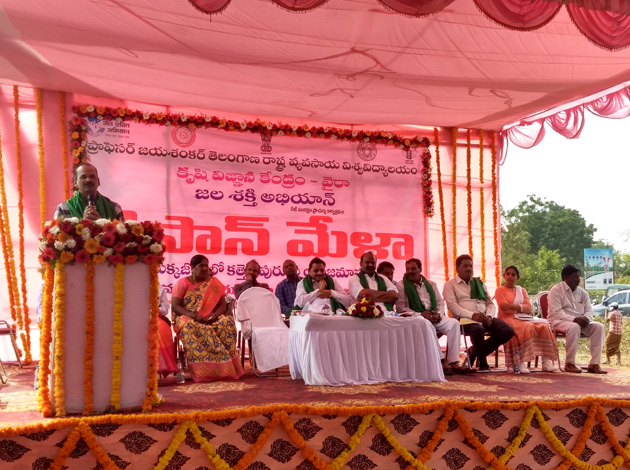 Kisan Mela was organized by Krishi Vigyan Kendra, Wyra as a part of Jal Shakti Abhiyan on 31.12.2019 at Allipuram (V), Khammam Urban (M), Khammam (D). Chief guest, Sri P. Ajay Kumar Garu, Hon’ble Minister for Transport, Telangana; Special guest Sri R.V. Karnan, District Collector and Magistrate; Distinguished Guests Sri Lingala Kamal Raj Garu, ZP Chairman, Sri Kondabala Koteswara Rao Garu, Chairman, TSSDC, Sri Nallamala Venkateswara Rao Garu, RSS District Coordinator, Sri G. Papalal, District Mayor, Sri. M. Venkata Ramana, Marketing Chairman; District officials Smt. P. Vijaya Nirmala, DAO i/c, and Project Director, ATMA, Khammam, ADA (Khammam), Sri. A. Srinivas, MAO’s, AEO’s and Dr. P. Jagan Mohan Rao, Associate Director of Research, CTZ, RARS, Warangal, Dr. S.J. Rahman, Principal Scientist (Entomology), Biological Control Lab, Hyderabad, Dr. P. Malathi, Senior Scientist (Entomology) , RARS, Warangal, Dr. B. Ram Prasad, Senior Scientist (Entomology) , RARS, Warangal, Dr. R. Srinivas Rao. Co-ordinator, DAATTC, Khammam, Dr. S. Srinivas, scientist, ARS, Madhira and 827 number of farmers were participated in the programme. As a part of Kisan Mela, stalls were arranged by KVK, Wyra and Department of Agriculture, on the various water saving technologies and other popular technologies. After the welcome address, the programme started by lighting the lamp by the guests and officials. A brief explanation on water management techniques and the moisture sensitive stages for realization of good yields in the different crops given by Dr. P. Sri Ranjitha, SMS (Crop Production), KVK, Wyra. All the guests and district officials have given their remarks on Kisan Mela and motivated the farmers towards water conservation. All the scientists participated in the farmer scientist interaction and given the information on the questions asked by the farmers. At last, the programme ended with the vote of thanks given by Dr. K. Ravi Kumar,SMS (Plant protection), KVK, Wyra.