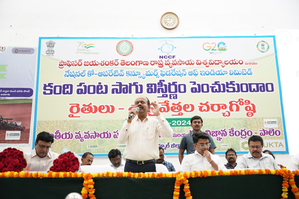 Regional Agricultural Research Station, Palem has organized a meeting on increasing the redgram area- Farmer-Scientist- Interaction on 29.06.2024 in collaboration with National Cooperative Consumers' Federation of India Limited (NCCF), Hyderabad. As the Chief guest of the programme Dr. K. Rajesh Reddy, Hon’ble Member of Legislative Assembly (MLA, Nagarkurnool) graced the occasion. The session was briefed by Dr. M. Malla Reddy, Associate Director of Research, RARS, Palem, who also educated the farmers about redgarm farming. Dr. S. Vanisri, PS (Oilseeds) discussed the value of pulses, selection of location specific varieties are very important. Dr. T. Prabhakar Reddy, Programme Coordinator, KVK, Palem emphasized thathigh-quality seed is crucial for pulses. KVK undertakes initiatives such as promotion of pulses production and introduction of new redgram varieties in the Nagarkurnool district through CFLDs and other demonstrations. Various awareness programmes have been organized to create awareness among the farming community.Dr. Ch. Barath Bushan, DAATT Center coordinator explained about the sowing window of redgram and best management practices. Shri. Purna Chandra Reddy, ADA, Nagarkurnool addressed gathering about importance of crop rotation, intercropping of redgram with and cotton and others leads to increase the yields of crop. Shri. Ravi Chandra, Branch Manager, NCCF- Hyderabad, explained the status of redgram crop in India and Telangana. He also informed that majority of the redgram is imported from other countries and based on this NCCF is encouraging farmers to cultivate redgram by distributed redgram variety PRG- 176 seed to the farmers on free basis. Shri. Suresh, Channel Partner- Technology, NCCF- New Delhi addressed the gathering importance of pulses and redgram is a profitable crop to the farmers by adopting new technologies increases crop productivity. He also explained aboutmarket intelligence tac tactics with best minimum support price and procedure of farmer’s registrationin NCCF website for marketing of redgram produce. Later a Farmer-Scientist - Interaction was done and farmers raised questions regarding management, quality seed and trade related questions. Dr. K. Rajesh Reddy, Hon’ble Member of Legislative Assembly (MLA, Nagarkurnool) addressed the farmers and good food- good health. For making good food good seed is required. He also suggested farmers to grow the crop according to climate changes, follow the technology and get profits. In this programme, scientists from RARS, KVK and APT, Palem and a total of 750 farmers from Nagarkurnool and Mahabubanagar districts were participated. Finally, the programme was wrapped up with the felicitation of dignitaries followed by Vote of thanks to the gathering.