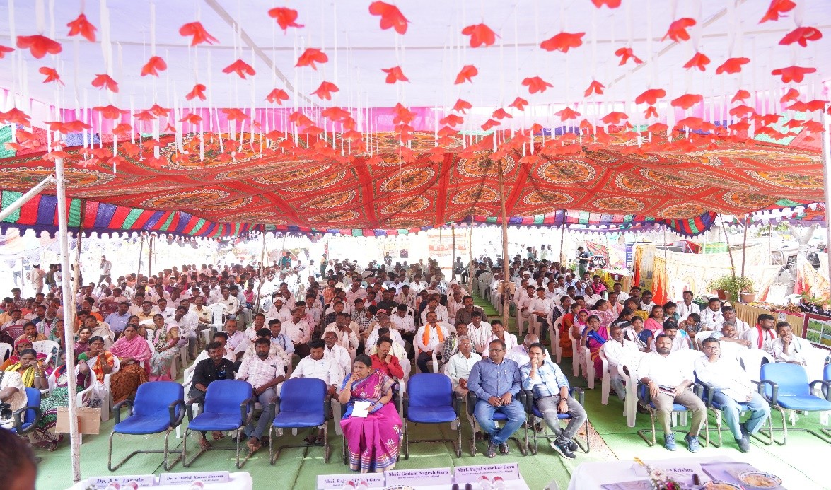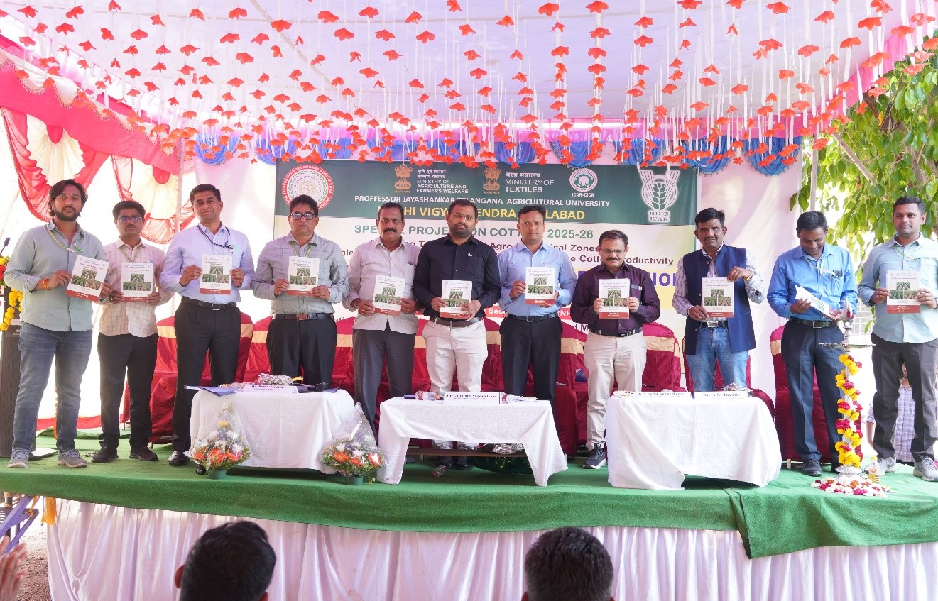 Krishi Vigyan Kendra (KVK), Adilabad organized a Kisan Mela cum Agricultural Exhibition on 25.02.2026, with active participation of around 700 farmers from different mandals of the district. The programme aimed at disseminating advanced agricultural technologies, particularly High Density Planting System (HDPS) in cotton. Dr. Harish Kumar Sharma, Associate Director of Research, Regional Agricultural Research Station (RARS), North Telangana Zone, and Dr. Arjun Tayade, Chief Nodal Officer from ICAR–Central Institute for Cotton Research (CICR), Nagpur, along with Dr. Ramakrishna, Senior Scientist, Dr. N. Rama Gopala Varma, Programme Coordinator, Dr. Y. Praveen Kumar, Associate Dean, Dr. Sreedhar Chouhan, Head, ARS, District Agriculture Officer, DDM, NABARD, Scientists from KVK and ARS, Faculty, Officers and NGO representatives graced the occasion. The dignitaries elaborated on scientific crop management practices in cotton, emphasizing the benefits of HDPS in achieving higher productivity and enhanced net returns. The experts highlighted that yield performance in cotton is significantly influenced by climatic factors, rainfall distribution and appropriate hybrid selection. They stressed that adoption of scientific agronomic management practices can result in substantially higher yields compared to conventional spacing methods. Farmers Scientists interaction organized to clarify field level issues directly. The event concluded with visits to various technology stalls, visiting drone sown sesamum field and a live field demonstration of pesticide spraying using drone technology, showcasing precision agriculture in action.