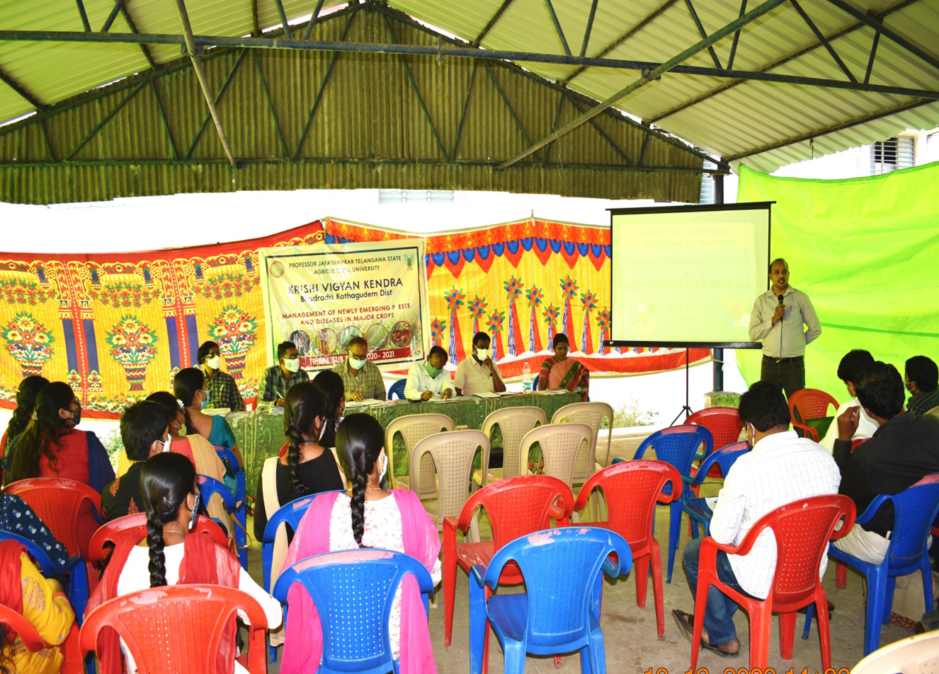 KVK, Bhadradri Kothagudem conducted Awareness programme on “Agriculture Farm Bills, 2020” for Extension functionaries at APMC market yard, Laxmidevipally, Bhadradri Kothagudem on 10-12-2020. Sri K. Abhimanyudu, DAO, along with ADAs, MAOs and AEOs of Bhadradri Kothagudem has participated in the programme. Dr. G.Veeranna, Programme coordinator has inaugurated the programme and explained about the importance of creating awareness on recent agricultural reforms to farming community through grass root extension functionaries. Dr. R. Vishwatej, SMS (Extension), has explained in detail about the three farm bills passed in the parliament and the context and the important points present in the bills as well as scope of increase in investments in agricultural sector for value chain infrastructure development. Later, he also clarified the myths and doubts raised by the farming community. A total of 81 participants attended the training programme.