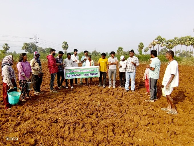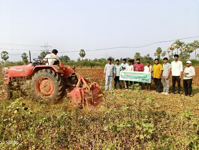 Krishi Vigyan Kendra, Bhadradri Kothagudem promoted and distributed bio-fortified paddy variety Dhan-48 released by the Indian Institute of Rice Research (IIRR), Hyderabad to farmers of Chunchupally and Laxmidevipally mandals on 24.12.2025. Dhan-48 is a bio-fortified variety with high zinc content (22–27 ppm) intermediate amylose content (23–26%) and a milling recovery of 69%. In the afternoon, along with RAWEP students, frontline demonstrations were conducted and participated in on cotton stalk incorporation instead of burning followed by greengram cultivation and an on-farm trial on promotion of groundnut variety Vasista through sowing activity at Machinenipet village, Julurpad Mandal. Later, the team visited the field of Best Farmer Sri Porandla Saidulu, a progressive tomato grower at Julurpad Village and Mandal and facilitated him with the Best Farmer Award. The award was presented at his field as he could not attend the Kisan Diwas programme held yesterday due to health reasons.