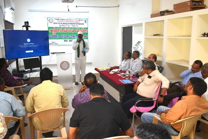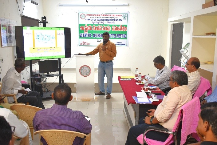 Krishi Vigyan Kendra (KVK), Bhadradri Kothagudem organized a Scientific Advisory Committee (SAC) Meeting at Krishi Vigyan Kendra on 06.01.2026. During the programme Dr. T. Bharath, Programme Coordinator presented the overall KVK activities and crop production work carried out during 2025–26 and the action plan for 2026–27. This was followed by Sri B. Shiva, Scientist who presented the Horticulture activities completed during 2025–26 along with the action plan for 2026–27. Subsequently, Dr. N. Hema Sarat Chandra presented the extension activities undertaken during 2025–26 and the proposed action plan for 2026–27. The programme was graced by Dr. R. Uma Reddy, Associate Director, RARS, Warangal, Dr. A. R. Reddy, Principal Scientist, ATARI, Hyderabad, Dr. V. Ravinder Naik, Associate Dean, Agricultural College, Warangal, Sri Shoban Babu, ADA (Technical); Sri Venkateswarlu, DVAO; Sri Imtiaz Ahmed, DFO, Dr. Sakthivel, Senior Scientist, NIPHM, Hyderabad and Sri K. Shankar Rao, Director, All India Radio Station. About 30 farmers actively participated in the discussion and shared their valuable remarks and suggestions.