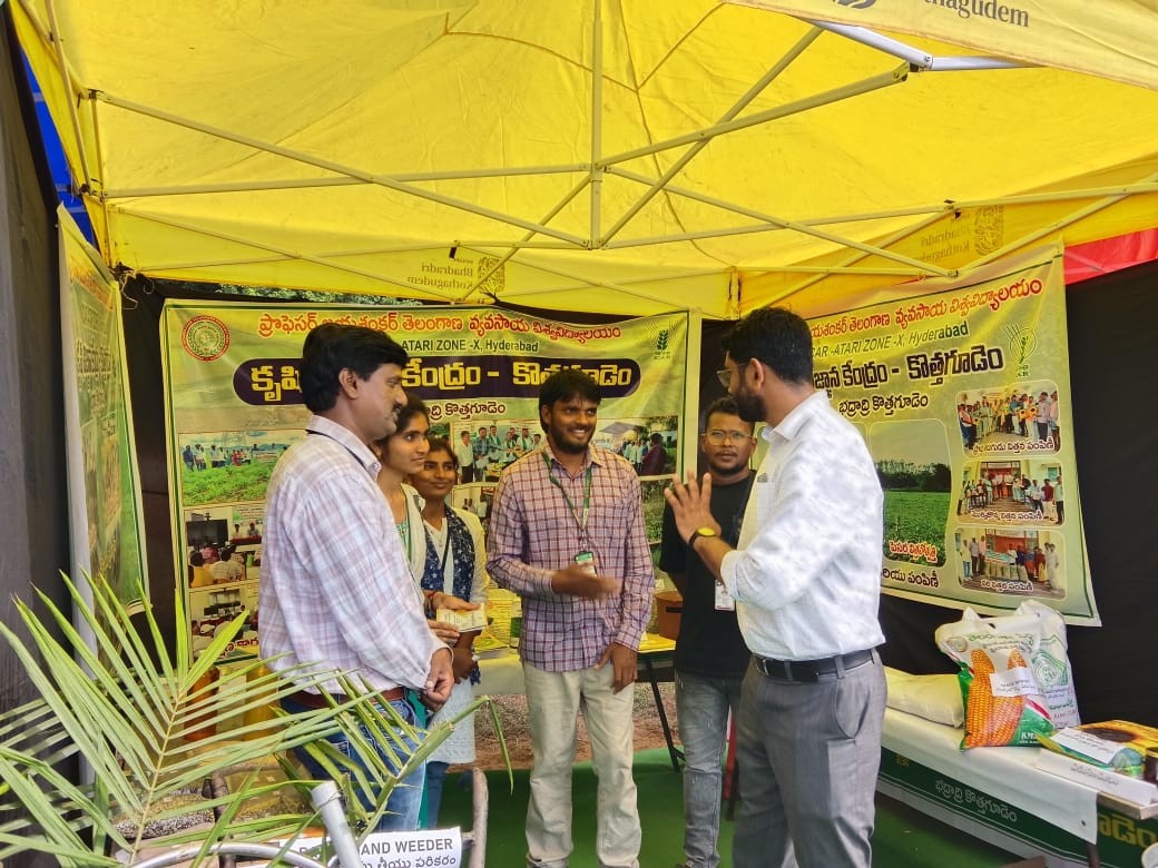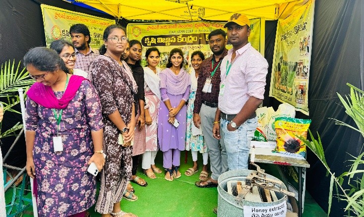 Krishi Vigyan Kendra, Bhadradri Kothagudem arranged a technology demonstration stall showcasing biological agents, natural farming products, various seed Minikits, paddy seed, quick soil testing kit, honey-bee extraction box with bee-keeping set, drum seeder, hand-operated paddy weeder and other climate-resilient agricultural technologies for the benefit of the farming community. The stall was set up during the inauguration of the Dr. Manmohan Singh Earth University by the Honourable Chief Minister Sri Anumula Revanth Reddy and other ministers at Kothagudem. The District Collector Sri Jitesh V. Patil, along with other district officers, students, farmers, and NGO representatives, visited the KVK stall and interacted with the scientists regarding the showcased technologies and their field applications.