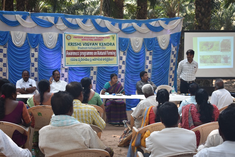 Krishi Vigyan Kendra, Bhadradri Kothagudem has conducted training programme on Natural Farming to farmers at Malkaram Village, Dammapeta Mandal, Bhadradri Kothagudem on 08.02.2023.In this awareness programme Dr. V. Lakshmi Narayanamma, Programme Coordinator, KVK, Bhadradri Kothagudem, discussed regarding soil degradation due to excessive usage of fertilizers and chemicals and explained about importance of natural farming and different method involves mulching, intercropping. Dr. B. Shiva SMS(Horticulture) discussed the preparation procedures and use of several products which include cow dung. the importance of natural farming. In this programme a total 80 farmers were participated.
