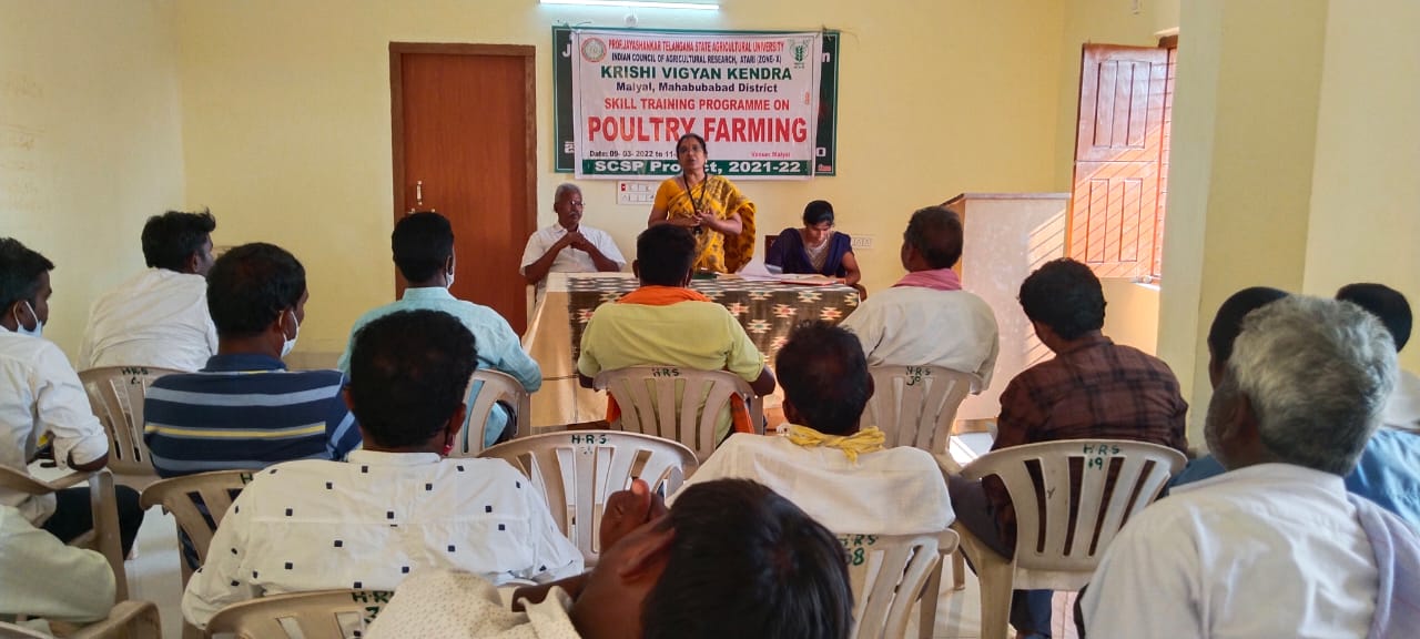 KVK, Malyal organized 3 days Skill Training on “Poultry Farming” from 9th to 11th March, 2022 at KVK, Malyal under SC Sub Plan Project, 2021-22 to the SC Farmers of SCSP adopted villages. The training started with inaugural session on 09-03-2022. Dr. S. Malathi, Programme coordinator, KVK, Malyal explained about need and importance of the programme. Smt. A. Ramulamma, SMS (Plant Protection) and Co-Principal Investigator, KVK, Malyal explained about objective of the Skill training programme Dr. T. Rajender Asst. Veterinary surgeon, Gandampally, Mahabubabad participated as resource person and delivered lecture on “Poultry Layer Farming ” B. Yakub Reddy, Commercial Poultry Farmer, Ameenapuram, Kesamudram mandal participated as resource person and delivered lecture on “Importance of Poultry Farming in Integrated Farming System and economic importance of Poultry” On 2nd day (10-03-2022) organized exposure visit to Livestock Research Station, Mamnoor, Warangal district. Dr. M. Hanumanth Rao, Senior Scientist, (Poultry Science) acted as Resource Person on the topics. “Rearing of one day old chicks, Hatchery unit, different poultry breed and different poultry demonstration units” were shown to the farmers followed by a lecture on “Management of Back yard poultry” in rural areas. On 3rd day (11-03-2022), Dr. L. Vidyasagar Asst. Professor, CVSc, Mamnoor, Warangal District delivered lectures on “Nutritional Importance of Poultry Feed” and “Pest and Disease management in Poultry Farming”. The valedictory session was chaired by Dr. S. Malathi, Programme Coordinator, KVK, Malyal and she addressed the gathering on importance of growing backyard poultry in the present days and the trainee participants should utilize the opportunity for entrepreneurship. Sri.G. Ravindra Naik, Regional manager, Srinidhi, Mahabubad explained about Rearing Backyard poultry - In Commercial way, Dr. S. Venkat, Additional District Rural Development Officer, DRDA, Mahabubabad participated as chief guest and explained about the opportunities for entrepreneurship development and distributed Certificates to the trainees. 25 SC farmers from SCSP adopted villages (Vissampally of Chinnaguduru mandal, Kantaipalem and Nanchari Madoor of Thorrur Mandal) participated in the programme.