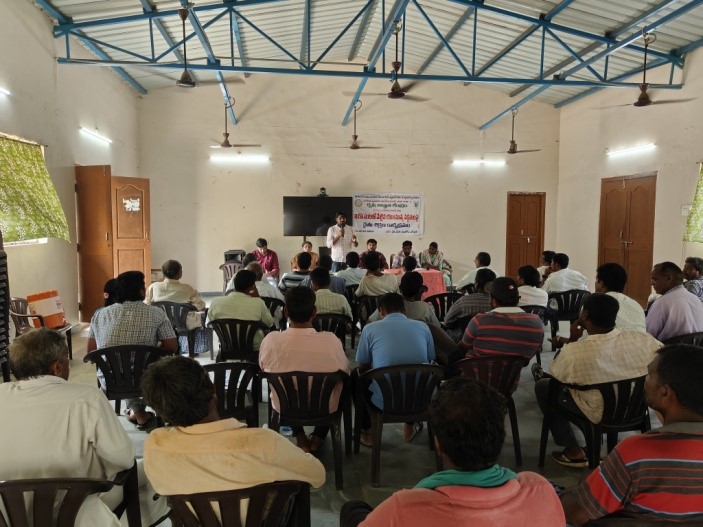 Krishi Vigyan Kendra, Malyal organized training programme on “Good management practices in Chilli” at Rythu Vedika, Chilukodu of Dornakal Mandal on 21-09-2024. Dr. E. Rambabu, SMS (Horticulture) explained about good management practices in Chilli - fertilizer management, correction of micronutrient deficiencies, integrated management practices for virus control. He emphasized use of biological control agents (Trichoderma, Pseudomonas, Beauveria bassiana and Lecanicillium lecanii), growing of border crop with Jowar/Maize, trap crops like Marigold, Castor, installation of yellow, blue sticky traps, use of neem oil, etc. Sri B. Kranthi Kumar, SMS (Crop Production) explained about nutrient management, pest and disease management of Cotton and Paddy in the current situation. Later conducted field visit to Chilli crop and also clarified the queries raised by the farmers on current pest and diseases of Chilli crop in the present situation. In this programme, Smt T. Jaya Raj, MAO, Seerole, Sri K. Avinash, AEO, Chilukodu cluster, Sri J. Pavan, AEO, Gollacherla, Smt Ch. Anusha Rani, AEO, Dornakal and 46 farmers participated.