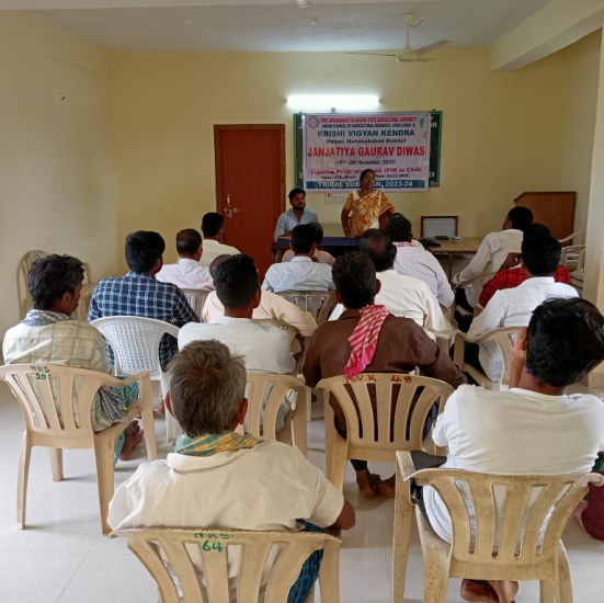 Krishi Vigyan Kendra, Malyal organized Training programme on IPM in Chilli to tribal farmers under Tribal Sub Plan project, 2023-24 at KVK, Malyal on 24-11-2023. As a part of Janjatiya Gaurav Diwas, Dr. E. Rambabu, SMS (Horticulture) explained about tribal freedom fighters, government schemes for the development of tribal people. Dr. E. Rambabu, SMS (Horticulture) briefed about IPM in Chilli with special emphasis on leaf curl virus and wilt management. Dr. S. Malathi, Programme Coordinator, KVK, Malyal explained about Suitable Paddy and pulses varieties for ensuing Yasangi Season. She also explained about Rabi, Paddy, nursery management which includes seed treatment, water management and plant protection measures. She also explained about drum seeding technology in paddy. Later, distributed 4.6q Sunhemp seed under Tribal Sub Plan, 2023-24 to 23 tribal farmer beneficiaries from Chakru thanda and Ootla villages of Gudur Mandal. In this programme, 23 farmers from these TSP adopted villages participated.