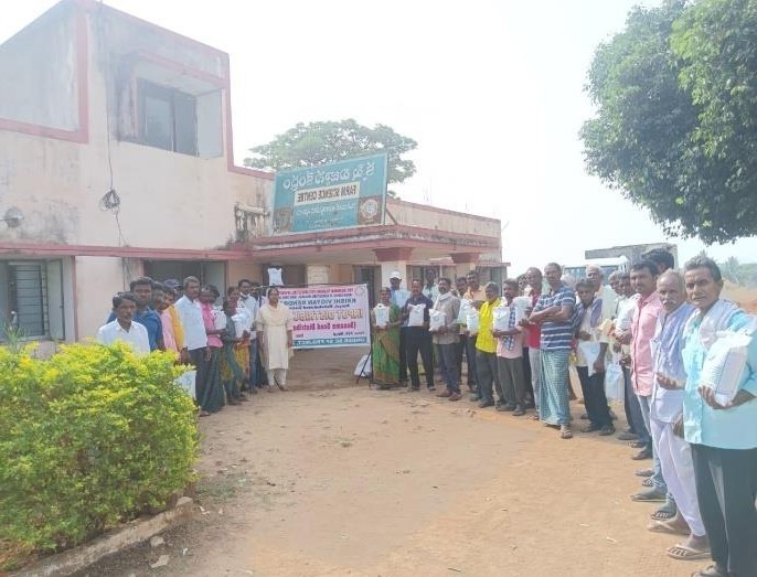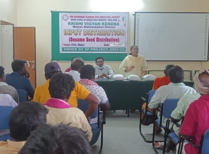 Krishi Vigyan Kendra, Malyal organized "Training cum distribution of Sesamum seed to farmers” on 31-01-2023 under SCSP operating at KVK, Malyal. In this programme, seed of sesame variety Swetha til (JCS-1020) was distributed to 30 farmers from Vissampalli village Chinna Gudur Mandal and Kantayapalem village, Thorrur Mandal of Mahabubabad district for summer sesame in 30 acres. Dr. S. Malathi, Programme Coordinator explained about characters of Swetha til (JCS- 1020) variety, Dr. N. Kishore Kumar, SMS (Extension) explained good agricultural practices for Sesamum growing and Dr. E. Rambabu, SMS (Horticulture) created awareness on pest and disease management in Sesamum. Later, Programme Coordinator answered the queries raised by the farmers.