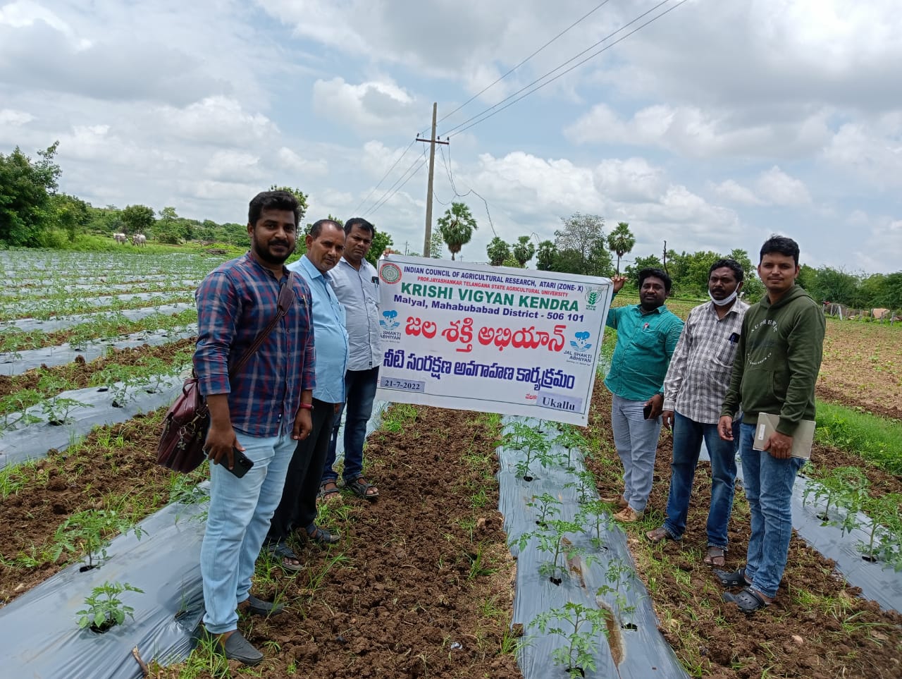 Krishi Vigyan Kendra, Malyal organized training programme on “water saving technologies” under Jal Shakti Abhiyan at Thalla ukallu village of Maripeda Mandal on 21-07-2021. Importance of Jal Shakti Abhiyan was explained by Dr. N. Kishore Kumar, SMS (Extn.) He explained that each one of us should implement rain water harvesting in fields as well as at home by constructing soak pits and explained water saving technologies in different crops. P.Jalendhar Naik, SMS (plant proction) KVK, Malyal addressed the gathering and explained the Concept of alternate methods of rice plantings, paired row maize, skip furrow irrigation, micro irrigation were highlighted. K.Shoban babu, ADA, Maripeda explained about need of water conservation technologies like farm ponds, counter buds and drip irrigation. He appeal the farmers should adopt wise water management options in agriculture, horticulture crops. After completing the training programme visited to HDPS cotton fields, green manure and vegetable crops fields (mulching in tomato and Bhendi). In this programme, Sri.Ch.seetharam Reddy, sarpanch, K.Satya narayana Reddy, MPTC Maripeda, B.Veera singh AO, Maripeda Srikanth, AEO, Thalla ukallu cluster, Md. Javeed Khan AEO, Burhanpur cluster and 45 no.of farmers participated.