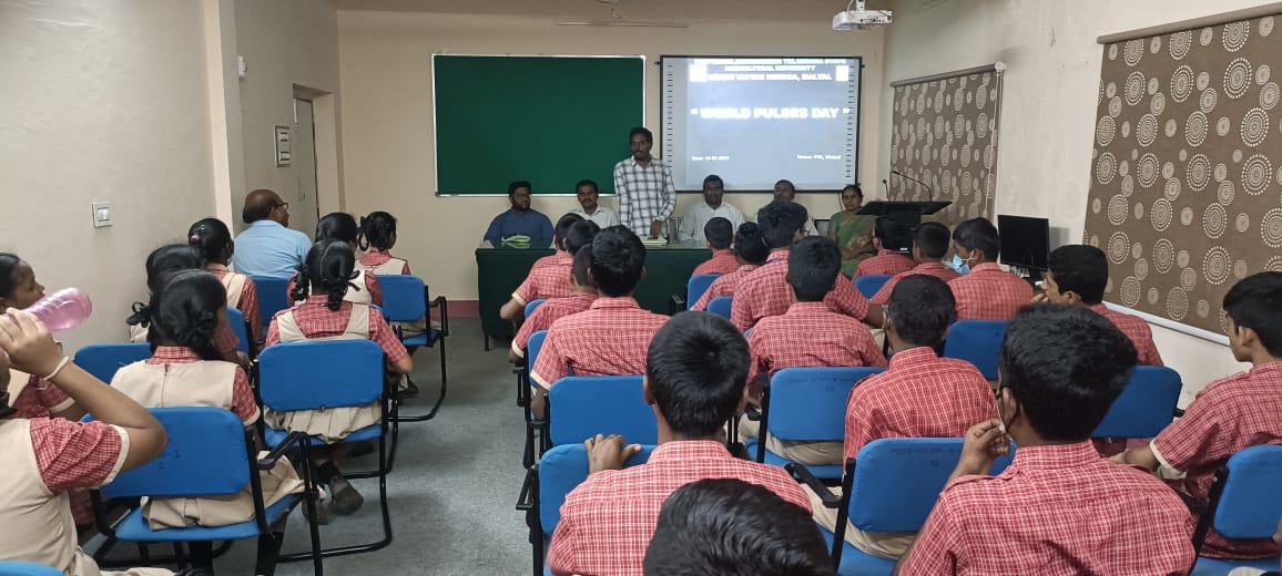 KVK, Malyal organized “World Pulses Day” on 10th February 2023 at KVK, Malyal. Dr. N.Kishore Kumar, SMS (Extension) KVK, Malyal addressed the gathering and explained the importance of World Pulses Day and the theme of the day –“Pulses for a Sustainable Future” and importance of pulses in a healthy diet. He also appraised main motto of celebrating pulses day is to spread awareness about nutritional as well as environmental benefits of pulses as a part of sustainable food production. He requested the farmers to grow pulses in atleast some part of land holdings to meet their house hold requirement. Sri. K. Bhaskar, Scientist(GPBR) & Head, SKLTSHU - HRS, Malyal explained about “Scope of Pulses in Horticulture crops as Intercrop”. He also explained that pulses are nutrient-dense, providing good source of vitamins and minerals that are vital for good health and suggested to the participants to eat daily requirement of pulses. Sri. A. Prasanth Scientist (Pl Pathology), HRS, Malyal explained about initial care in pulse crops to avoid disease/ plant problems in the crop period. In this programme, Sri. M.Chittibabu Agromet Observer, 3 no. of school faculty, 35 no of school childerns from Sri Chaitanya School, Mahabubabad and 7 no. of farmers participated.
