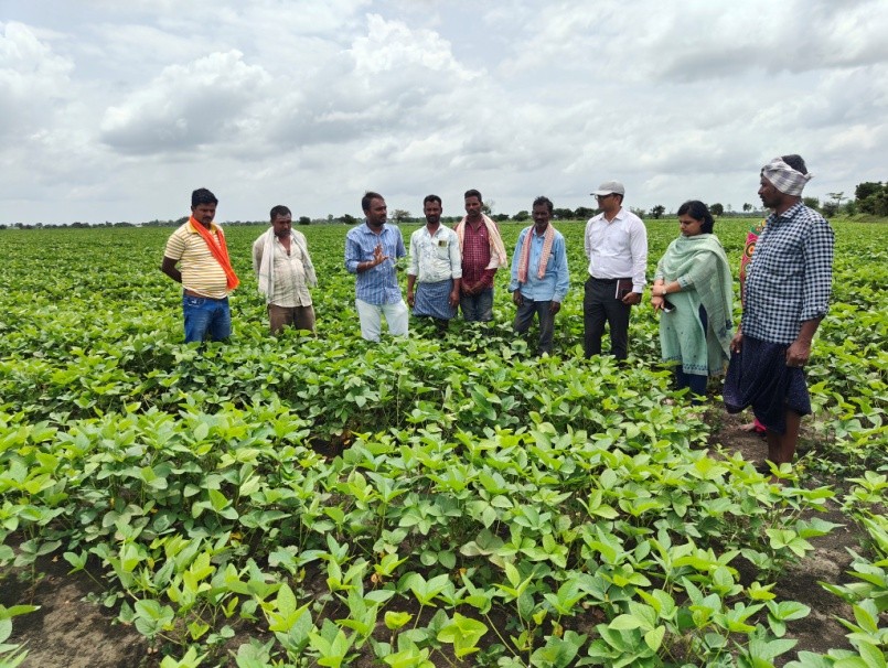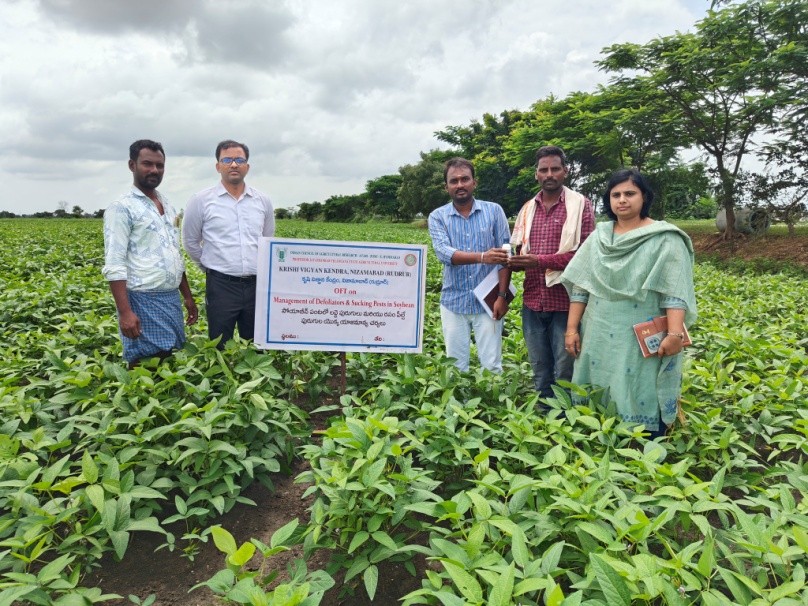 KVK, Nizamabad (Rudur) scientists conducted Field visit in Soybean crop at Hegdoli village, Pothangal mandal on 31.07.2025. As a part of the technical programme on Management of Defoliators and Sucking pests control in Soybean crop, Sri.P.Vijay Kumar, SMS (Plant Protection) visited OFT farmers fields in which the crop is at vegetative stage with 25-30 DAS and observed Spodoptera incidence below ETL and distributed need based chemical inputs as a part of treatment imposition to OFT farmers. Later, Diagnostic field visit was conducted in Soybean crop in which Sri.P.Vijay Kumar, SMS (Plant protection) along with Dr.K.Indudhar Reddy, SMS (Crop Production) and Dr.M.Swetha, SMS (Agril. Extension) interacted with the farmers regarding varieties cultivated, pests and diseases frequently damaging in that particular area,etc. During the visit, Spodoptera incidence was noticed and advised for spraying with Emamectin benzoate @ 0.4 g/lit or Novaluron @ 1 ml/lit or Chlorantraniliprole @ 0.3 ml/lit of water during morning or evening hours.