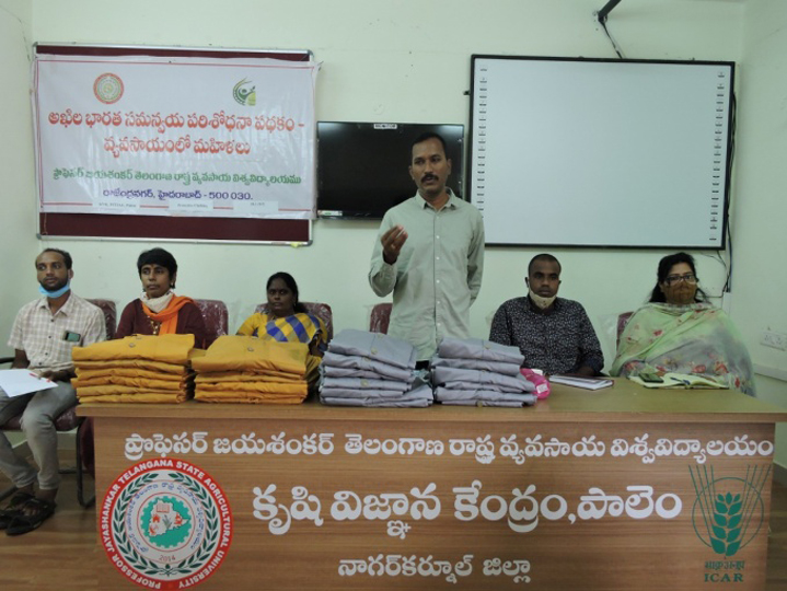 KVK, Palem organized Awareness cum method demonstration on personal protective clothing in collaboration with All India Coordinated Research Project on Women in Agriculture (AICRP-WIA) on 18.01.2022 at seminar hall of KVK, Palem. The main theme of the programme is to reduce the ill effects on harmful pesticides and other health effects on agricultural workers. In this programme Dr. T. Prabhakar Reddy (PC, KVK, Palem) created awareness among the farmers about the usage of protective clothing like wearing helmets, gloves, masks, shoes and washing the used clothes in separately after spraying. Dr. T. Kamalaja & Dr. Lakshmi Pooja (Scientist, AICRP-WIA, Rajendranagar, Hyderabad) briefed about the materials used in preparation of protective clothing, requested to farmers must and should wear the protective clothing while doing any agricultural operations in their fields. Questionnaire to elicit the acceptance of PPEs designed were distributed to the farmers. A demo was organized on wearing, safety of the personal protective clothing. Mr. M. Rajashekhar SMS-PP, stressed on ill effects caused due to indiscriminate spraying and the ways and means to overcome these side effects. With regard to the usage of protective clothing, emphasis was given on the type of cloth to be used and preparing indigenously. In this programme Dr. B. Rajashekhar, Dr. Afifa Jahan and a total of 30 farmers from Khanapur and Venkatapur were participated.