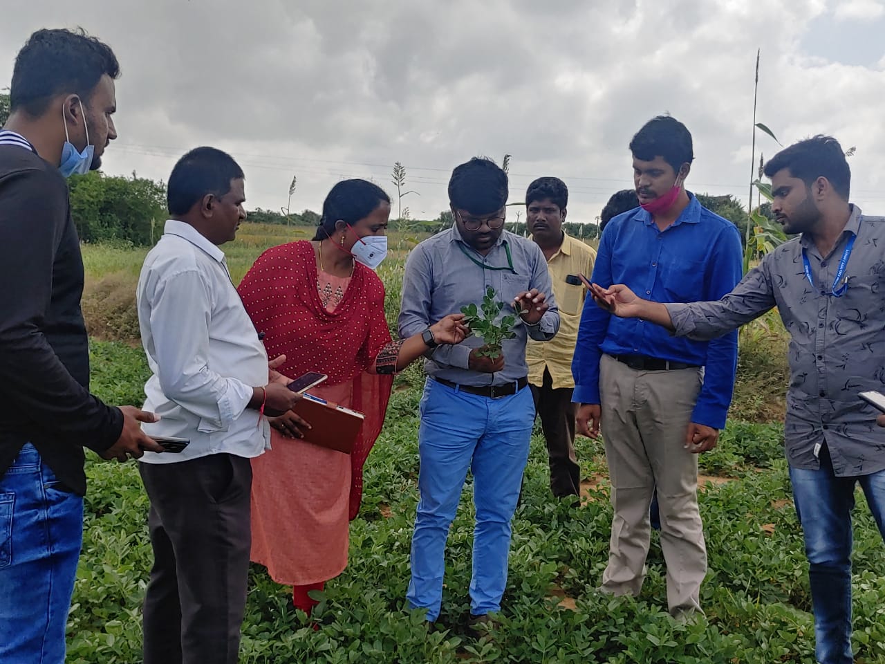 Krishi Vigyan Kendra (KVK), Palem, RARS, Palem and DAATTC, Palem scientists conducted diagnostic filed visit to Groundnut crop in Donur and Vasupula villages of Ranipet mandal, Boinpally village of Midjil mandal and Boothpur cluster mandal . Observed the severe incidence of spodoptera and basal stem rot in groundnut crop. The following management methods were suggested to the farmers. To reduce the incidence of tobacco caterpillars suggested installation of Pheromone traps @ 4/acre, need based spraying with Indoxicarb and nuvaluran @ 1ml/L of water and to control the basal stem rot with drenching of Carbendizam + Mancozab 2.5 grams / liter water. In this visit Dr. K. Sridhar, Scientist (Agronomy), RARS, Palem, K. Ramakrishna, SMS (Crop Production), KVK, Palem, Dr. P. Archana, TOT (Scientist), DAATTC, Palem along with concern cluster AEOs and 36 progressive farmers participated.