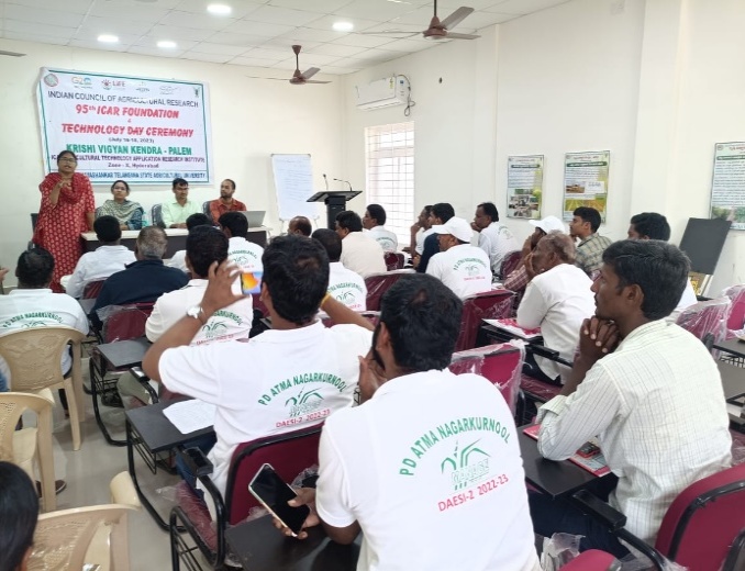KVK, Palem has organized ICAR Foundation day & Technology day celebrations at KVK, Palem from 16.07.2023 to 18.07.2023 on the eve of 95th foundation day celebrations. Dr. Adhi Shankar, SMS (Horticulture) addressed about importance of KVK's and functioning mechanism and Created awareness to the participants various technologies demonstrations units in Agril. and allied sectors and Integrated Crop Management technologies in major crops. Mrs. E. Jyoshna, SMS (Community Science) briefed about importance of value addition in millets and pulses and motivated farmers towards entrepreneurship development millets and pulses and also explained about Dietary diversification in controlling malnutrition in rural areas. Dr.O. Shaila, SMS (Plant Protection) explained best management practices in crops, income enhancement activities like vermicompost technology, mushroom cultivation and bio fertilizer production unit etc. Dr. B. Rajashekar, SMS (Extension) explained the various initiates taken up KVK, Palem for effective transfer of technology to the rural areas with location specific. Later organized exposure visits to various demonstrations units at KVK, Palem. In this programme all the staff of KVK, Palem and 114 participants including students were participated.
