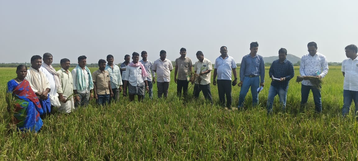 KVK, Palem in collaboration with RARS, Palem conducted a Diagnostic field visit to paddy fields at Balmoor Village and Mandal, Nagarkurnool District on 11.04.2025. A complaint was raised by the farmers viz., Sri. M. Surendhar Rao, Sri. B. Thirupataiah, Sri. C. Eeshwaraiah, Sri. G. Lingaiah, Sri. J. Balaraju and Sri.S.Satyam regarding poor quality of paddy seed of Sanjeevini variety Mfg by M/s. Palamoor Seed Pvt. Ltd and purchased from retailer M/s. Mani Hari Sai Traders, Balmoor. At the time of team visit to the fields, the crop was at panicle initiation stage and the crop was already completed 125 days duration. The crop should be ready for harvest by now, but it is still in panicle initiation stage. The farmers have sown long duration variety recommended by the trader and it is not suitable for Rabi season under late sown conditions and the variety (Sanjeevani) performed susceptibility against all the pest and diseases. The team made a close observation of complained variety (Sanjeevini) and compared them with other adjacent non-complaint paddy fields of Telangana sona (RNR 15048) that have grown under same package of practices. In the same location non complaint fields where early variety Telangana sona was opted, the crop was good and all the insect pests were below ETL. The crop is ready for harvesting. Severe infestation of stem borer, blast, Zn deficiency and moderate incidence of BPH was observed in complained variety. Further Sulphide injury was also noticed as plants in patches were rotten and foul smell was observed. Mild salinity was also noticed in the field. Farmers have taken up control measures to control by spraying Propiconazole @ 1ml/ lit, Tricyclazole + Plantamycin, Silica and Plant growth promoters as per the recommended dosages. However, still the majority of the field was observed with one or the other above-mentioned stresses. In this visit Dr. T. Prabhakar Reddy, PC, KVK, Palem, Dr. K. Sridhar, Scientist (Agro.), RARS, Palem, Dr. K. Sadaiah, Scientist (Pl.Br.), RARS, Palem, Sri. N. Chandrasekhar, DAO, Nagarkurnool, Sri. K. Naresh (MAO, Balmoor, Nagarkurnool), Sri. Pavan (AEO- Balmoor), Sri. Ratnarao (AEO-Kondanagula), Sri. B. Thirupataiah, Sri. C. Eeshwaraiah, Smt. Ch. Ramulamma, Sri. Satyanarayana, Sri. M. Surendhar Rao, Sri. G. Lingaiah, Sri. J. Balaraju and Sri. S. Satyam of Balmoor village & Mandal a total of 23 members were participated.