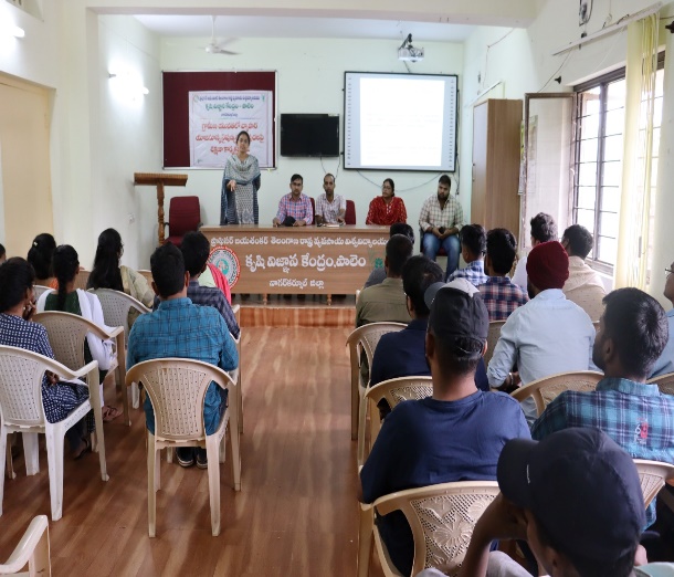 KVK, Palem has organized Training programme on Imparting entrepreneurial behaviour characteristics for the Rural youth at KVK, Palem on 19.08.2023 to Rural Youth & graduates. Dr. B. Rajashekar, SMS (Agril. Extension) briefed about entrepreneurial opportunities in agriculture and allied sectors and key characteristics for successful entrepreneur and its importance in timely execution of activities and stressed different income generation activities like Vermicomposting, Nursery management, Seed processing, protected cultivation and Value addition in millets etc. and later trainees visited various demonstration units of KVK, Palem and interacted with concern scientists. In this programme all the scientific staff of KVK, Palem and 35 rural youth were participated.