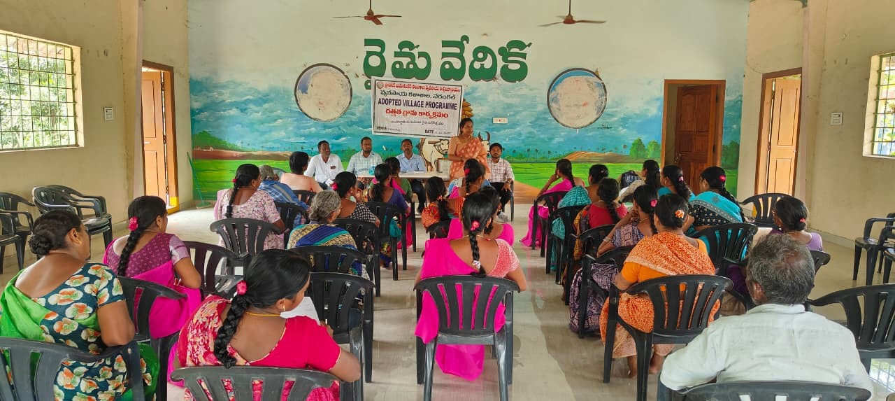 The Village Adoption Committee of Agricultural College, Warangal, organized a programme on “International Mahila Kisan Diwas” on 15th October, 2025 at the adopted village, Pulukurthi. The event was attended by the village adoption committee members and Agricultural Extension Officer. A total of 25 women farmers from the village participated in the programme. During the event, the women farmers were felicitated in recognition of their valuable contributions to agriculture and rural development. The village adoption members interacted with the participants and delivered talks on kitchen gardening, organic farming, and the role and importance of women farmers in agriculture. The discussions emphasized the need for sustainable and eco-friendly farming practices to ensure better soil health, nutritional security, and environmental protection. The programme concluded with an interactive session, during which the women farmers shared their experiences and expressed their gratitude for the recognition and guidance provided.
