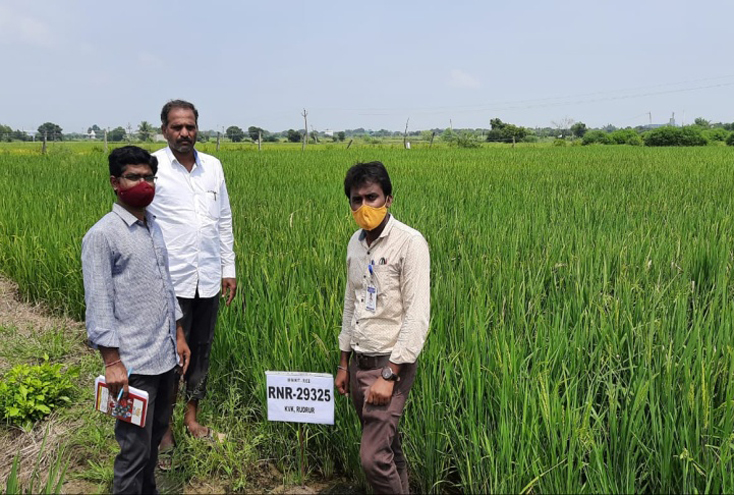 Krishi Vigyan Kendra, Rudrur conducted a Monitoring field visit to Rice Minikit trials at Narsapur village Bodhan Mandal of Nizamabad district on 30.09.2020. Minikits viz., RNR 21278, RNR-29325, JGL-27356 and JGL-28325 performance was observed by Dr. M. Suresh, Subject Matter Specialist (Crop production) and Sri. P.Vijay Kumar, Subject Matter Specialist (Plant Protection) by involving the farmer Sri P. Raghuram Prasad garu and noticed growth performance and other parameters of the Minikits and explained about the characteristic features of the Minikits and recorded the observations. The performance of minikits was good. Farmers satisfied with good growth and expected high yield.
