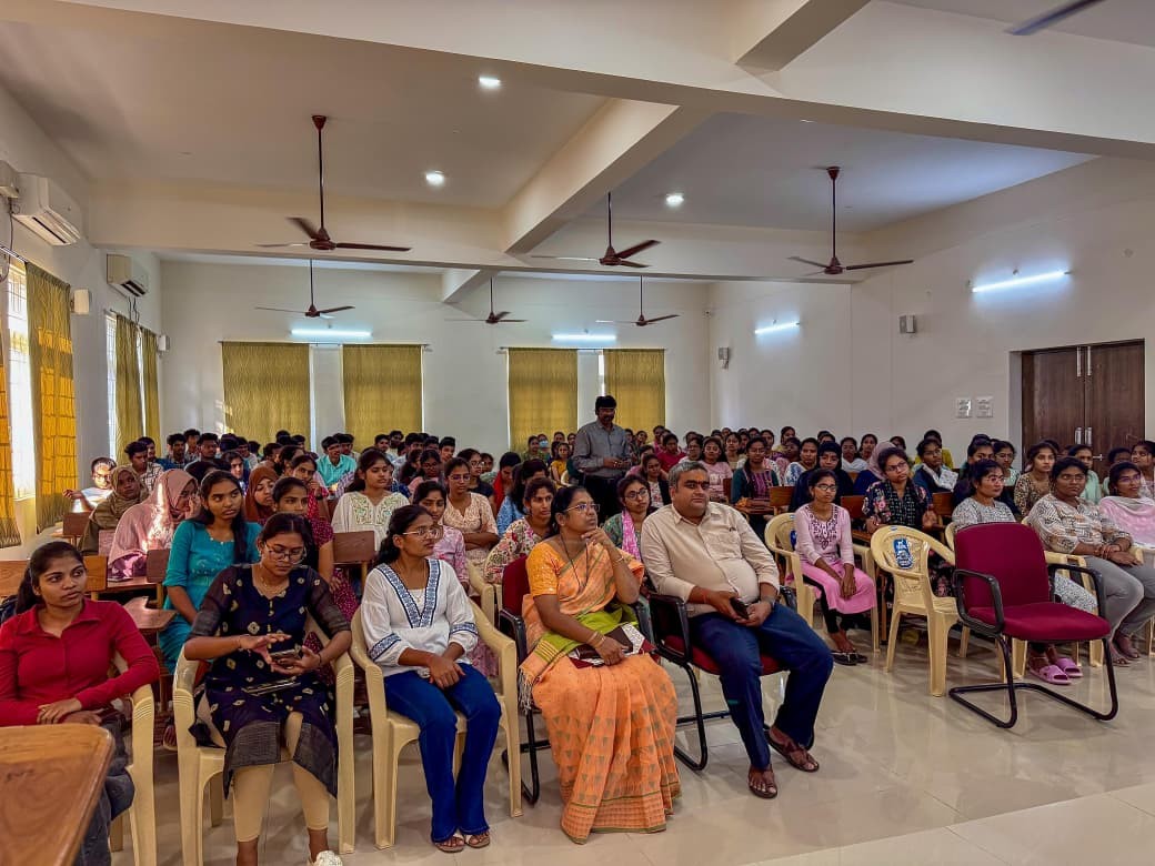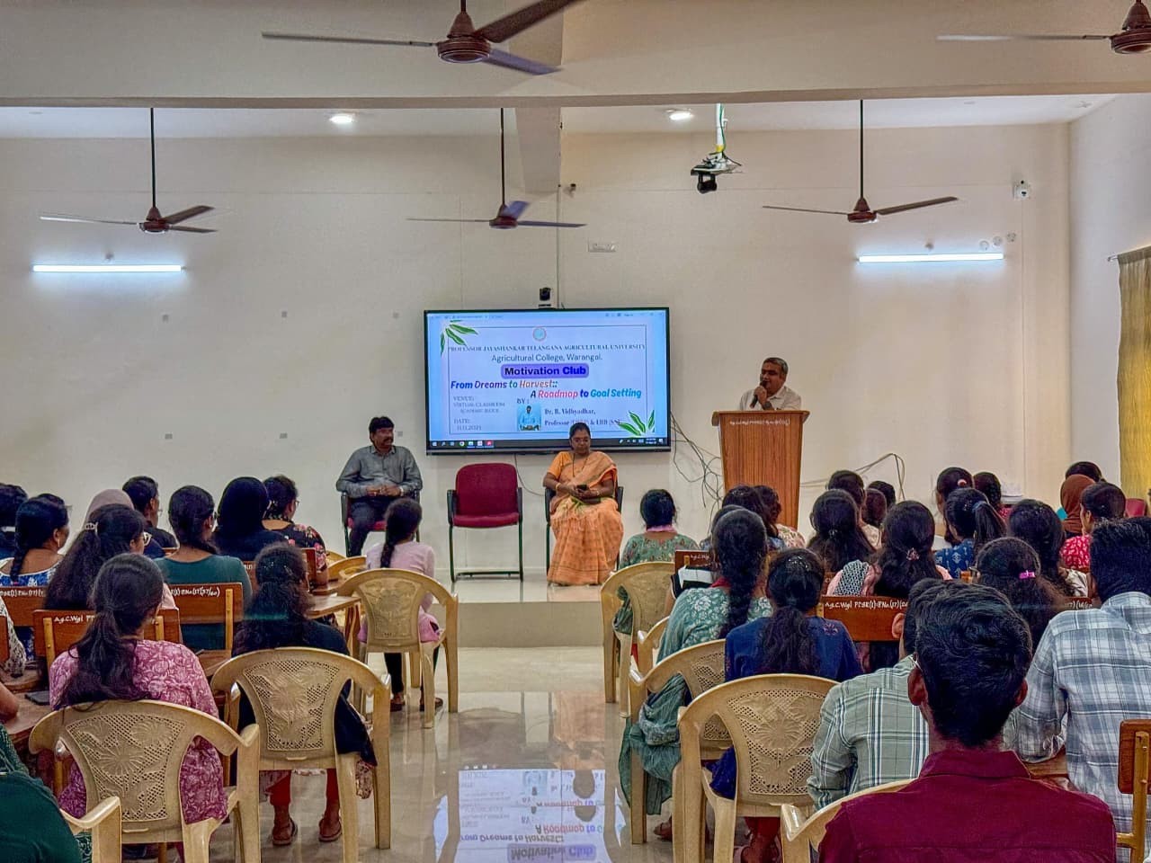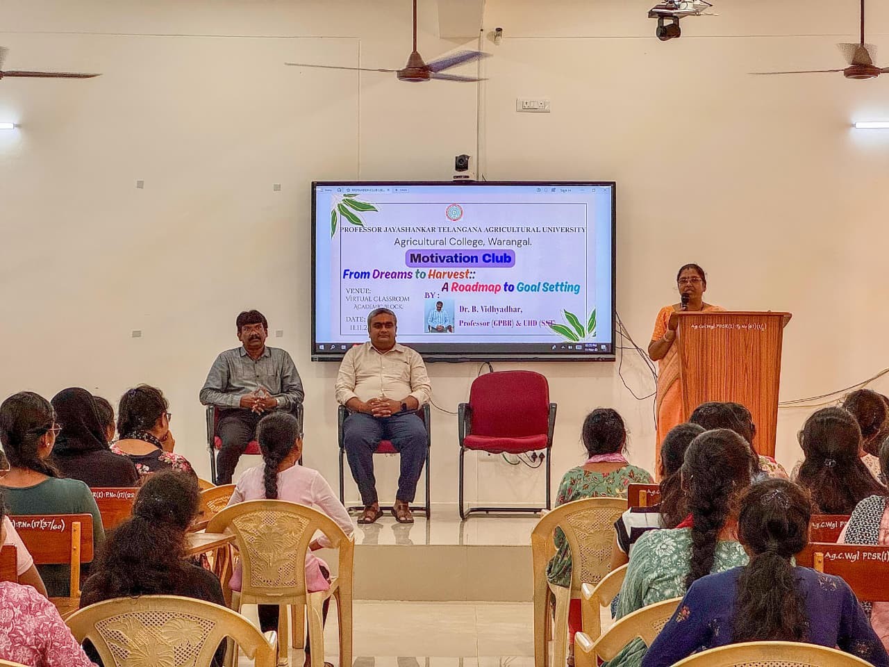 The Motivation Club of Agricultural College, Warangal organized a motivational talk on the occasion of National Education Day i.e. on 11-11-2025. On this occasion, Dr. V. Ravinder Naik, Associate Dean, Agricultural College, Warangal addressed the gathering on the importance of Education system and opined that a strong foundation is laid in the Universities to build a strong, progressive and inclusive nation. Dr. S. Malathi, Professor & Head (Division of Plant Science and Plant Protection) addressed the gathering about different proposed activities of motivation club for the academic year, 2025-26 and requested the students to participate in different club activities. Dr. B. Vidhyadhar, Professor (Genetics and Plant Breeding), Agricultural College, Warangal delivered a motivational talk on “From dreams to harvest : A roadmap to goal setting” in which he highlighted that each student shall fix a long term goal and work towards achieving that by designing and working through short term goals. Focus has to be given for all round development of their personality. Student organizers of the Motivation club P. Tapaswini, S. Vyshnavi, M. Charan Raj, K Rameshwari, Ameena Saher, B. Sirisha, Varun Sandhesh arranged the logistics of the meeting of the club activity. About 130 first year students attended the meeting.