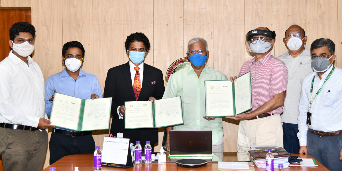 PJTSAU – Hyderabad, 25th June 2021: The Memorandum of Understanding(MoU) has been executed between Professor Jayashankar Telangana State Agricultural University(PJTSAU), Asia Pacific Flight Training Academy Limited (APFTAL)and Marut Dronetech Private Limited here on Friday in the presence of PJTSAU vice chancellor D r V Praveen Rao. This MoU was executed by Dr S Sudheer Kumar, Registrar, PJTSAU, Mr. Hemanth Dhandapani,CEO, M/s Asia Pacific Flight Training Academy Limited and Mr. Prem Kumar Vislawath,CEO, M/s Marut Dronetech Private Limited, at the program organized through offline mode in committee hall -1 in Administrative office, PJTSAU, Rajendranagar. As part of this agreement three organizations will cooperate in conducting training, research and development activities with Unmanned Aerial Vehicles automation and intelligence. PJTSAU, APFTAL and Marut Dronetech propose to work towards RPAS (Remotely Piloted Aircraft System)Training wherein APFTAL and Marut Dronetech proposes to design, develop, and deliver the training to trainees and PJTSAU proposes to make available the required infrastructure for the RPAS training on mutually agreed basis. APFTAL and Marut Dronetech propose to offer training on RPAS based on mutually agreed upon commercial terms and conditions wherein Marut shall design and develop course structure as per DGCA approved CAR and offer the required software, RPAS, drones and related equipment and peripherals. The training shall be offered by APFTAL as required by the Director General of Civil Aviation (DGCA). The PJTSAU shall provide the required space and infrastructure such as open areas for flying and classrooms for ground training. PJTSAU, APFTAL and MARUT DRONETECH will jointly establish a Skill Development Center on RPAS /Drone Technology. The center will conduct periodical skill development programs and demonstrations for students, farmers and extension officials with the help of ITE&C-TS and state agriculture department. PJTSAU will disseminate the improved technologies through training cum awareness programs for students/ rural youth/ farmers/ stakeholders/ extension functionaries/ beneficiaries and other stake holders. PJTSAU would act as a nodal center for generating and providing information on protected cultivation and precision farming. PJTSAU and ITE&C Department Shall facilitate educate and inform all Telangana State Govt and other government departments towards benefits of usage of these technology platforms towards effective and efficient conduct of their workflow. Also orient and encourage the various Departments to allocate personnel to avail these training schedules. Dr Jagadeeshwar , Director of Research, and the university officers of PJTSAU were present the program.
