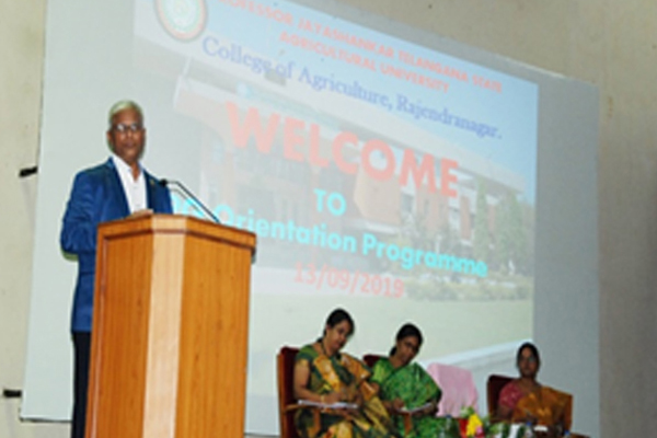 The orientation programme for the newly admitted PG students of 2019-20 was conducted in the Auditorium of College of Agriculture, Rajendranagar on 13th Spemtember,2019. About 141 students of M.Sc. (Ag) , 39 students of Ph.D. from agriculture stream and 16 M.Sc and 4 Ph.D. from Community Science stream joined this year. The programme started with a brief introduction by the Associate Dean, Dr.Seema followed by the address by the Dean of PG studies, Dr.K.V.S.MeenaKumari. She emphasized on the improvement in the quality of the research work and various facilities available at the campus. The Chief Guest of the programme, Dr.V.Praveen Rao, Hon’ble Vice Chancellor, PJTSAU addressed the students. He encouraged them to obtain degrees from different universities and get a wider exposure. He suggested the students to choose their research work which is of societal relevance. He also asked them to identify the research gaps and explore new areas of research in nanotechnology, artificial intelligence etc. He also emphasized on the facility of Central Instrumentation Cell, wherein students can work for late hours to carry out the analysis. The Vice Chancellor announced the setting up of the pilot centres on oil extraction unit, dal mill, bakery unit etc. The guidelines, rules and regulations of PG programme was presented in detail by Dr. V. Hemalatha, PG Academic In-charge followed by the vote of thanks.The programme was attended by the Members, Board of Management, Heads of Department and Department PG-incharges.