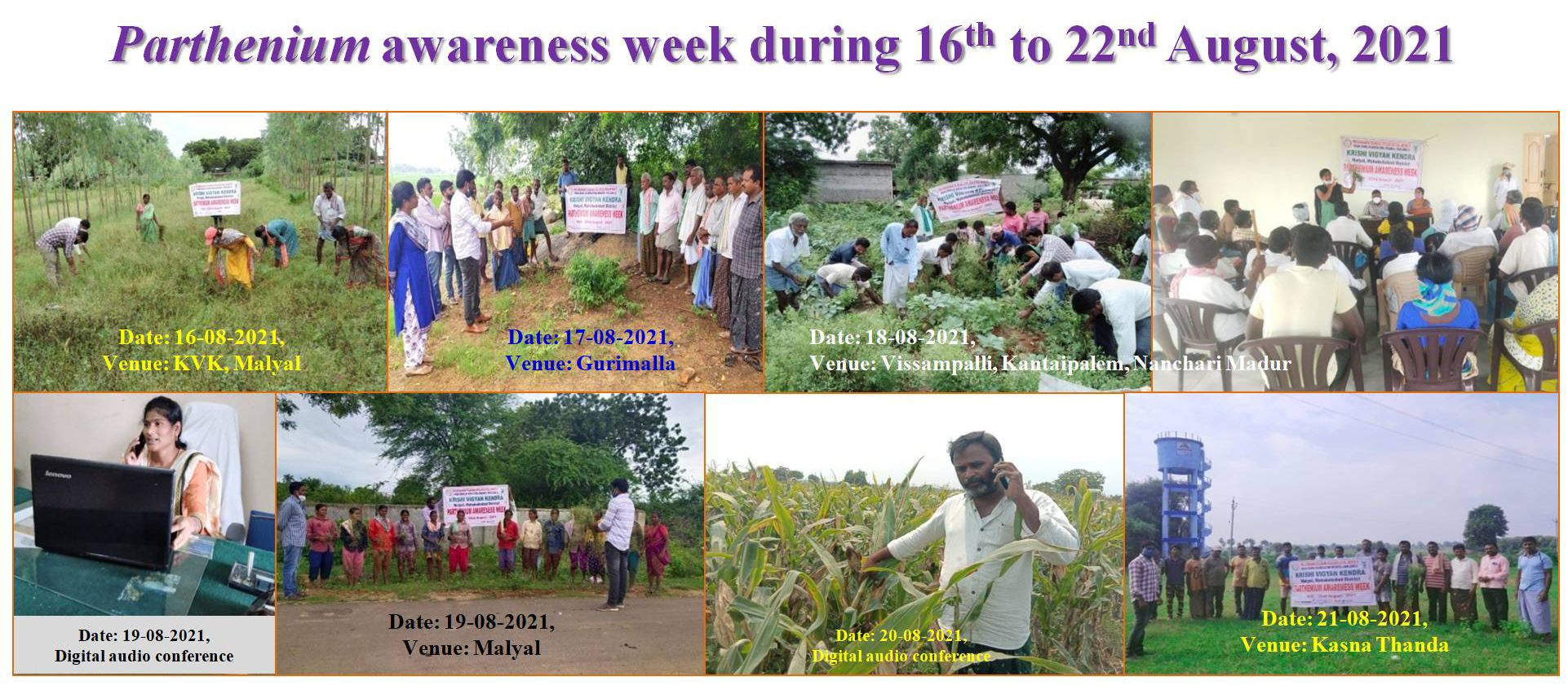 Krishi Vigyan Kendra, Malyal organized series of events to observe “Parthenium awareness week” from 16th – 22nd August, 2021. As a part of this, organized Parthenium eradication camp at KVK, Malyal on 16th and 19th August, Parthenium awareness programme at KVK adopted village – Gurimalla on 17th August, awareness programme in SCSP adopted villages – Kantaipalem, Vissampalli, Nanchari Madur on 18th August, Digital audio conference through virtual mode in collaboration with Reliance foundation to Warangal (Rural) farmers on 19th August and Mahabubabad farmers on 20th August, awareness programme in Kasna Thanda village on 21st August. In these programmes, awareness on ill effects of congress grass both on agriculture, horticulture crops and on human and animal health were highlighted bringing awareness on the wide spread weed. Compost preparation with Parthenium and biological control of Parthenium also were explained. Dr. S. Malathi, Programme Coordinator, KVK, Malyal and Smt. A. Ramulamma, SMS (Plant Protection) and Sri B. Kranthi Kumar, SMS (Crop Production) acted as resource persons for these events. Other KVK staff also participated in few events. Number of farmers participated in these programmes were 23 (17-08-2021), 60 (18-08-2021), 44 (19-08-2021), 41 (20-08-2021), 19 (21-08-2021).Sri G. Ramesh and Smt. Varahalu from Reliance foundation acted as convenors for the Digital Audio Conferences on 19th & 20th August, respectively.