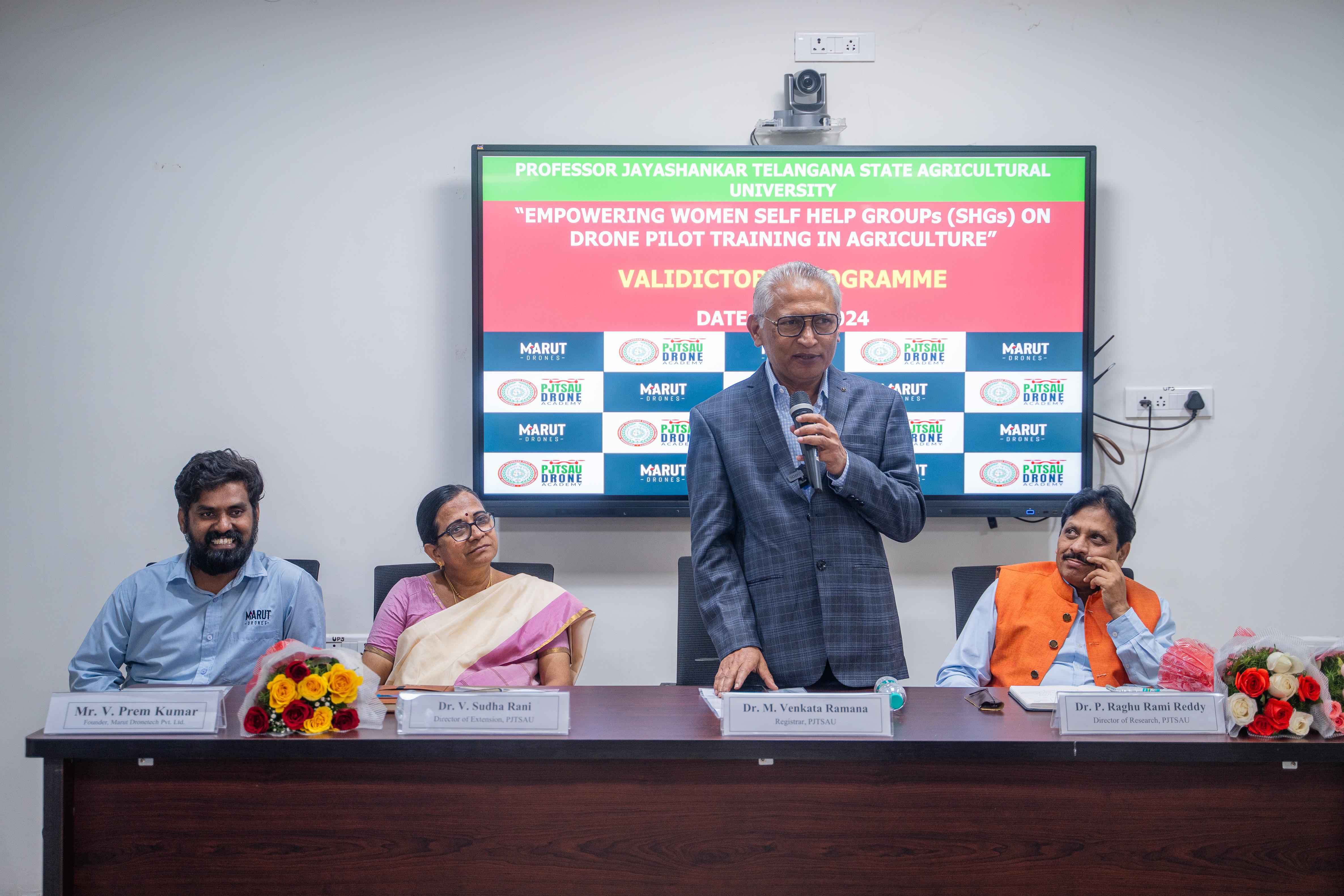 In an effort to encourage drone usage in agriculture, PJTSAU Drone Academy of Professor Jayashankar Telangana State Agricultural University has conducted Remote Pilot training to Women Self Help Groups and their officials sponsored by Hindustan Urvarak & Rasayan Limited from 10.1.2024 to 19.1.2024. The Pilot Licence Certificates and course completion certificates were issued to the first batch on 19.1.2024. The trainees gave positive feedback about the programme. Dr. V. Sudha Rani, Director of Extension expressed her happiness over the good initiative to train women SHGs on drones, and requested the participants to harness the benefits of this training and motivate others on drone usage. Dr. P. Raghu Rami Reddy, Director of Research, PJTSAU congratulated all the trainees for completing this skilful training effectively. Dr. M. Venkata Ramana, Registrar applauded the efforts of PJTSAU staff and Collaborator Marut Drones for successful completion of 1st batch of women SHGs from Uttar Pradesh and suggested to train and motivate others to derive the benefits of this new technology. In this programme Mr. V. Prem Kumar, Founder CEO, Marut Drones, Shri. V. Prem Kumar, Dr. Ch. Damodar Raju, PS (Rice) & Head, IRR, Dr. N. R. G. Varma, PS (Ento) and Nodal Officer (drones), IRR, Dr. T. Kiran Babu, Scientist (Pl.Path) & accountable manager, PJTSAU Drone Academy and Maurth Drone Team participated.