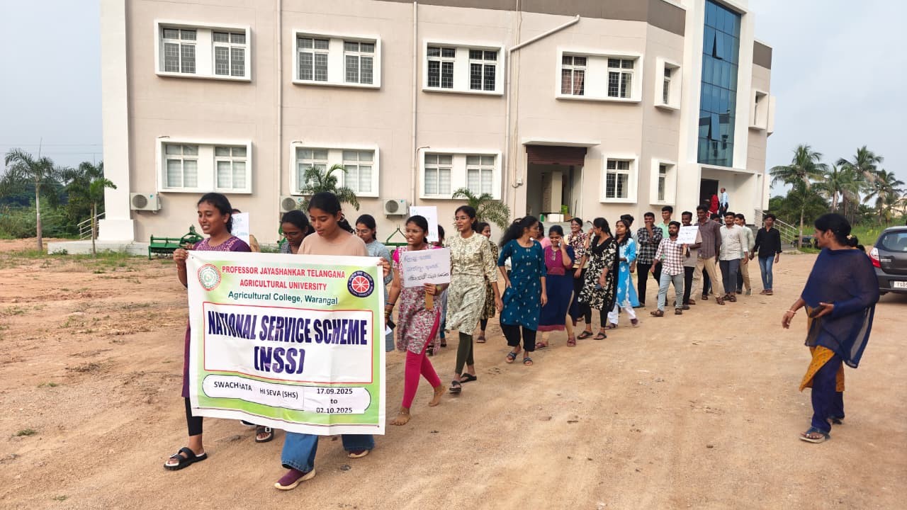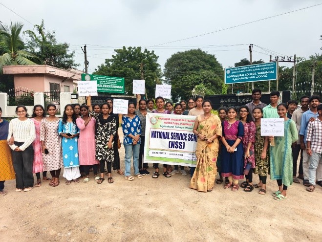 The NSS Unit of Agricultural College, Warangal, under the guidance of the NSS Programme Officer, Smt. K. Gopika, Assistant Professor (Plant Pathology), organized an Awareness Rally on Cleanliness in the college campus and nearby areas on 22.09.2025, under the Swachhata Hi Seva (SHS) Campaign 2025. A total of 50 NSS volunteers, along with all the teaching staff, actively participated in the programme. The rally aimed to spread awareness among students and the general public about the importance of cleanliness, hygiene, and a plastic-free environment. Volunteers and staff actively participated by carrying placards, raising slogans, and interacting with local residents to spread the message of “Clean Campus, Green Campus” and “Swachh Bharat – Swasth Bharat.”. The programme concluded with all participants taking a pledge to contribute towards cleanliness and to promote a healthy, pollution-free environment.