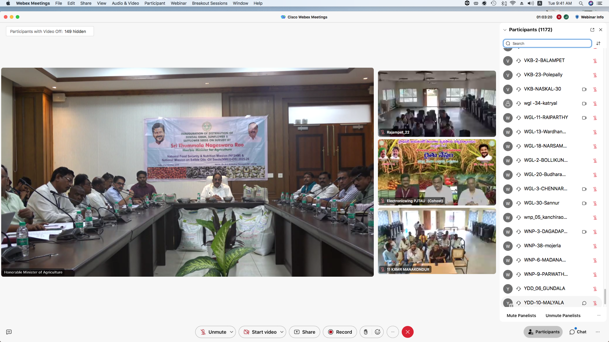 The programme primarily focused on the distribution of Bengal gram, sunflower and safflower seed by Hob’le minister of Agriculture, Telangana State. Sri. Tummala Nageshwara rao and who insisted the farmers to follow good management practices explained by the Scientists. Salient features of Bengal gram varieties NBeG -47 and NBeG-252 were explained by Dr.M.V.Nagesh Kumar, Director Seeds and varietal charecteristics of Sunflower and Safflower were explained by Dr. Sreedhar PS, Oil seeds. Followed by Dr.Rukmini, Principal Scientist (Pulses) and Head, ARS, Madhira, gave detailed description of pulse crop management practices to be taken up. Later Director of Research, PJTAU interacted with farmers. Dr.B.Gopi , Director of Agriculture , Govt.of Telangana , Dr. M.Balram, , Dr. M.Yakadri, Director of Extension, PJTAU graced the occasion. The programme was attended by Dr. M. Sreenivasulu, Principal Scientist [Extn] & Coordinator, Electronic Wing along with Team, Officials from Department of Agriculture, Directorate of Agriculture and officials of line departments and about 45,000 farmers from 1578 Rythu Vedikas participated in the programme across the state.