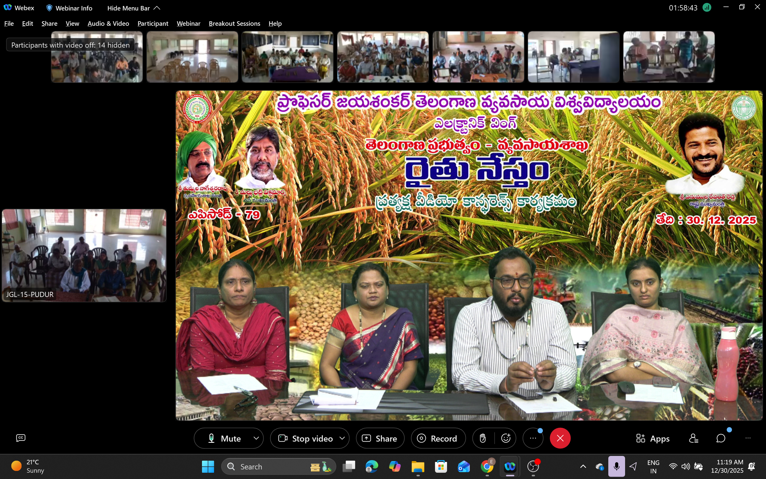 Rythu Nestham Live video conferencing of 79th episode was conducted from Electronic Wing Studio at ARI, Rajendranagar on 30-12-2025 from 10 AM to 11-45 AM The programme started with talk of Dr. K. Vani Sree, Senior Scientist (Entomology) AINP on Pesticide Residues, on Pesticide Residues & Remedial measures, followed by Dr. S. Srinivasa Rao, Sr. Scientist (Agronomy), AICRP on Forage Crops unit, ARI, Rajendranagar explained about various options available for cultivating fodders. Later in the session Smt. K. Manasa Assistant Professor College of Horticulture Rajendranagar briefed the farmers on Plant protection measures in Mango (Winter season). The programme was presided by Sri. Narsimha Rao, Additional director of Agriculture and conducted by Dr.J.S.Sudha Rani, Sr. Scientist ( Agro), Electronic wing and officials from Directorate of Agriculture. Programme was attended by officials of Agri and allied departments and about 30,000 farmers from 1582 Rythu Vedikas participated in the programme across the state.