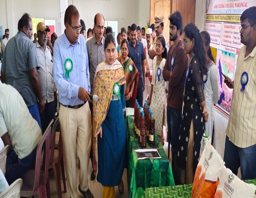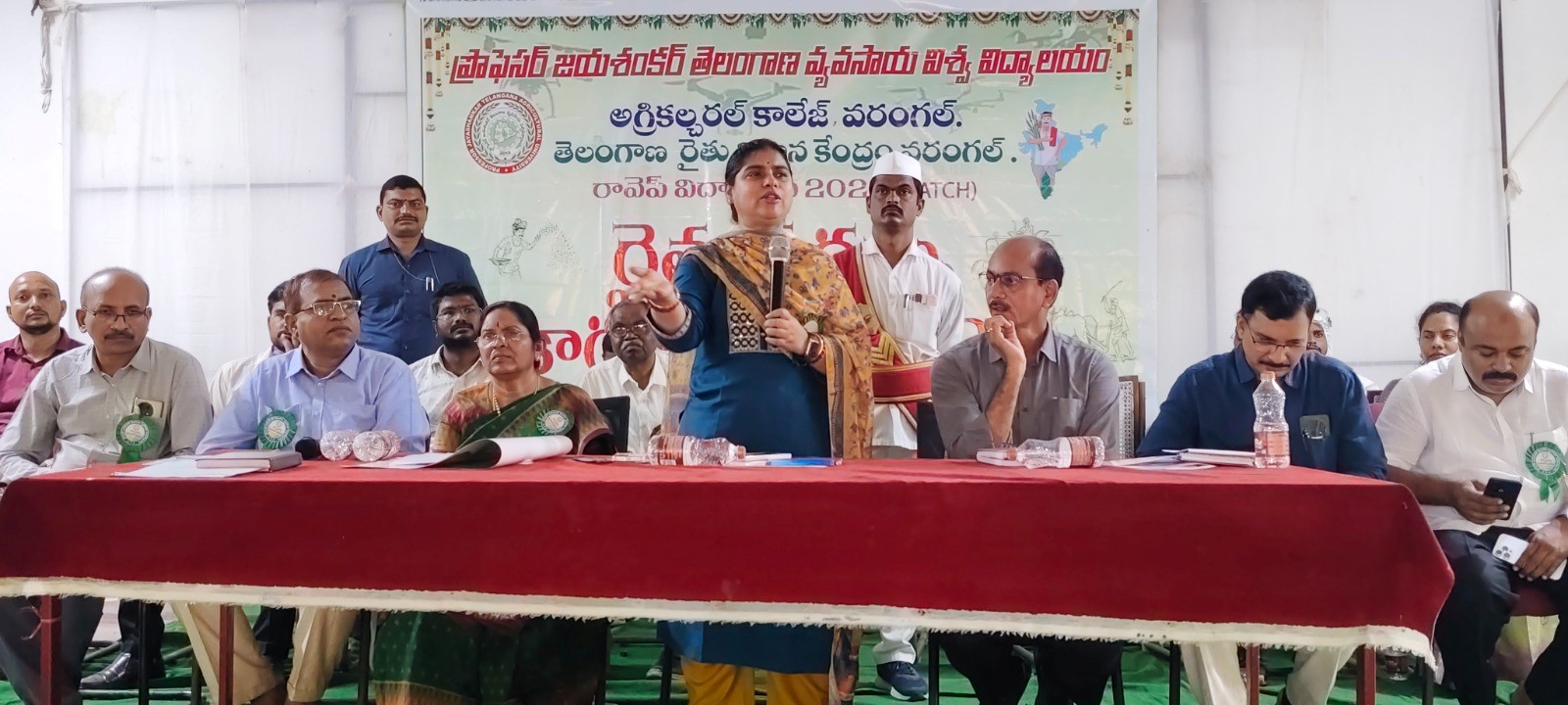 Telangana Rythu Vigyan Kendra, Warangal and RAWEP students of Agricultural College, Warangal organized the Rythu Sadassu and Agriculture Exhibition on 10.10.2025 at Elkurthi Haveli village of Geesukonda mandal of Warangal district. Dr. Satya Sharada, District Collector and Magistrate, Warangal graced the occasion as a chief guest and advised the students to act as a bridge between agricultural scientists and farmers in bringing developed technologies to the farmers' fields. She asked students to stand by farmers by preparing them for the new horizon in agriculture in the coming period and the changing times. Dr. R. Uma Reddy, Associate Director of Agricultural Research, urged farmers to maintain soil health and avoid excessive use of fertilizers to get maximum yield by adopting mechanization in agriculture. Dr. A Vijaya Bhaskar, Co-ordinator of Telangana Rythu Vigyan Kendra, Warangal ,suggested the preventive measures against bacterial leaf blight, grain discolouration , mite in paddy crop and Black arm,Grey mildew ,Boll rot ,pink bollworm in cotton crop , explained the importance of the crop rotation with Pulses,oilseeds,millets , Vegetables and emphasized the seed treatment for yasangi crops to get.