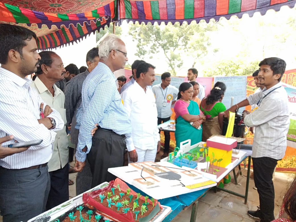 Rythu sadassu cum Agriculture exhibition was organized by RAWEP students in collaboration with DAATT Centre, Nalgonda in Chandanapally village of Nalgonda mandal and district at Community hall on 20-11-2019. Dr. K. Avil Kumar, Associate Director of Research, Southern Telangana Zone and Dr.M.A.Arrif khan , Programme Coordinator, KVK, Kampasagar are the chief guests of the programme. ADR inaugurated the Exhibition stall and visited the models prepared by the students and appreciated their efforts. Students displayed and explained the concepts, themes in brief. The students arranged about 48 stalls as a part of the Agriculture exhibition which includes Integrated farming system, Types of mulching, Biogas, New paddy varieties of PJTSAU, water shed, Vertical Farming, Alternate wetting and Drying in Rice, Solar Fencing, Millets importance, Rain water harvesting, Monkey gun, waste decomposer, Waste management. IPM in Rice, IPM in Cotton and Farm ponds.etc. Around 100 number of school children and 150 farmer's from different villages have utilized the opportunity and visited the exhibition models. After the exhibition Sh.G.Narendar, Scientist (Crop Production) and Coordinator (i/c) welcomed the guests on to the Dais and programme started by lightening of lamp followed by University Song. Later he explained the Aim and importance of RAWEP and brief activities done by RAWE students in toto to the dignitaries, officials and farmers. Students from different villages shared their experience about the RAWEP and few host farmers expressed that the programme is very helpful to the villages also as this increases the practical knowledge and continuous Field visits,. Dr.K.Avil Kumar appreciated the efforts of students and DAATTC for organizing Rythu sadassu. He interacted with farmers on the issues of emerging problems like water scarcity and unavailability of Labour. At last, the programme was concluded with the vote of thanks by B.Madhushekar, Scientist (TOT, DAATTC, Nalgonda).