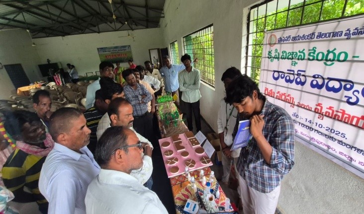 On October 14, 2025, a Rythu Sadassu cum Agricultural Exhibition at Duggepally village, Thripuraram mandal was organized by KrishiVigyan Kendra, Kampasagar and the RAWEP students of Agricultural College, Palem. The event was attended by Dr. N. Lingaiah, Principal Scientist and Head, ARS Kampasagar as the chief guest and S. Karuppaiah, Manager-Marketing at Madras Fertilizers Limited (MFL), as the Special Guest. The event was attended by esteemed guests, including, Dr. Prashanth, Asst. professor. Agril. College, Palem, PJTAU, Dr. V. Sridhar, Sr. Scientist, ARS, Kampasagar, Mrs. A. Ramulamma, Scientist, KVK, Kampasagar, Mrs. T. Himabindu, Scientist, KVK, Kampasagar smt. Saritha, ADA, Anumula, Smt. Parvathi chouhan, AO, Thripuraram, Sameer, AEO Duggepalli, Smt, Radhika, Village Secretary, Duggepally. The programme commenced with the lighting of the lamp and a speech by Dr. K. Chandrashaker, he has given the key notes of the programme and highlighten the role of RAWEP in Agricultural Degree programme. Dr. N. Lingaiah, ARS, Kampasagar given suitable suggestions to RAWEP students, emphasised on measures to be taken for current situation in field crops and promoted sustainable agricultural practices.