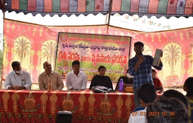As part Rural Agricultural Work Experience Programme (RAWEP) 2020-21, students studying final year B.Sc (Ag), College of Agriculture, Aswaraopet, Agricultural College, Jagityal and Palem attached to KVK, Bhadradri Kothagudem organized a Rythusadassu cum Agricultural Exhibition at Pathaanjanapuram village, Sujathanagar Mandal. Dr. V. Lakshmi Narayanamma, Programme Coordinator along with Smt. Bhukya Vijaya Laxmi (MPP, Sujathanagar) has inaugurated the Exhibition stall and viewed the models and exhibits displayed by the students. Dr. R. Vishwatej, SMS (Extension) welcomed the guests on to the Dias and explained the importance of RAWE Programme and Rythu Sadassu cum Agricultural Exhibition organized by RAWEP students to the farmers. Dr. T. Pavani, Asst. Professor & PR (Aswaraopeta) explained about the activities at College of Agriculture and importance of RAWE programme for the agricultural graduates. Students displayed and explained the concepts, themes in brief on on Drum Seeder Technology, Direct broadcasting of paddy, Alternate wetting and Drying in Paddy, Integrated Farming System (IFS), Types of Mulching, protective clothing while spraying, water conservation methods and Solar Energy etc. and also shared their experiences in during the RAWE programme to the audience. Dr. V. Lakshmi Narayanamma congratulated the students for organizing the rythu sadassu with a large gathering and appreciated the preparing suitable models and explaining to the farmers. A total of 53 farmers participated in the event and interacted with students and clarified their doubts with the students. Later, students has proposed vote of thanks for PC and SMS of KVK, Agricultural officers, local representatives, farmers and media for making the programme successful.