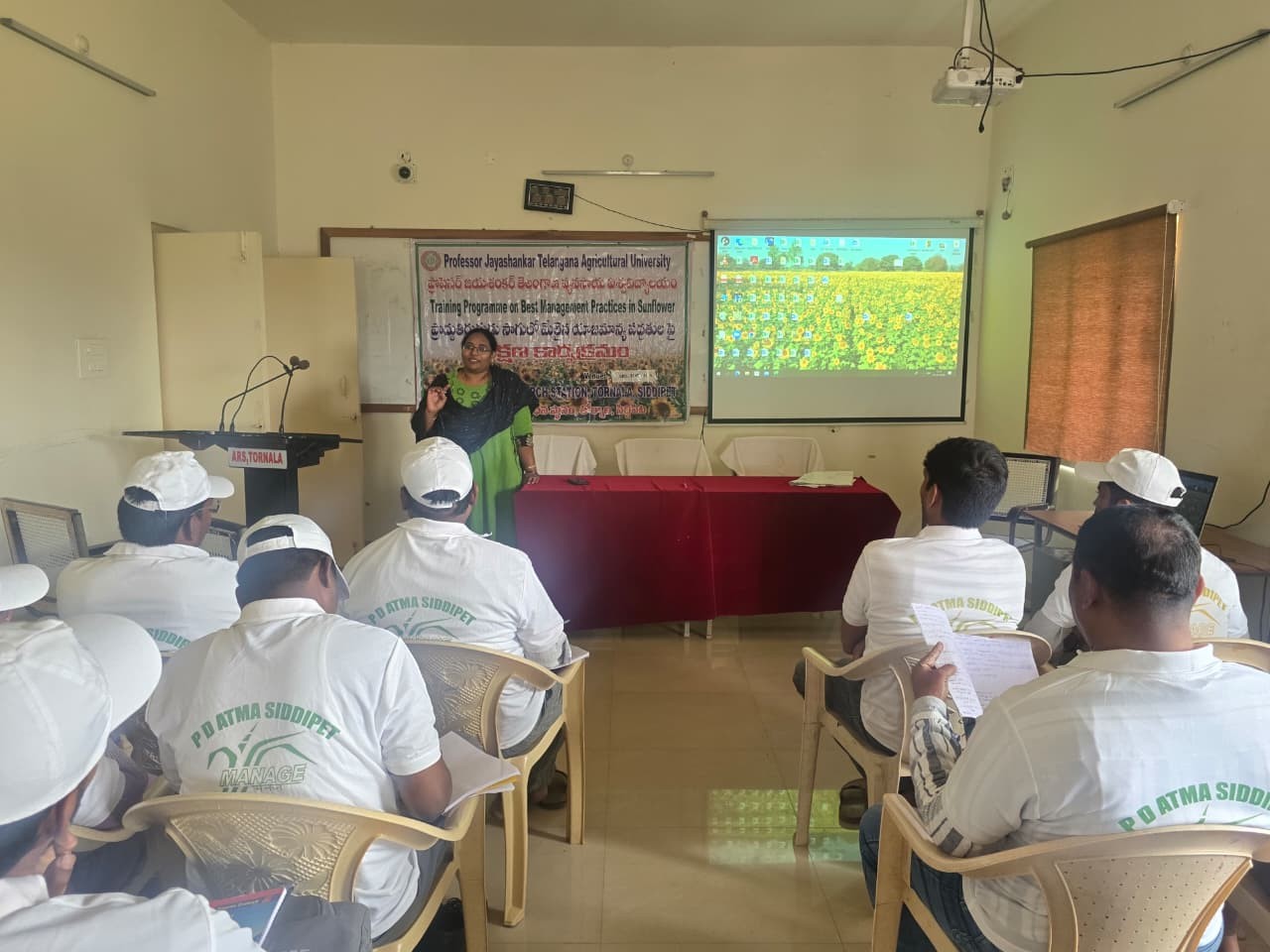 A Training programme on “Best management practices in Sunflower” was organized by Agricultural Research Station, Tornala to input dealers under DAESI program (Diploma in Agricultural Extension Service for Input Dealers) on 05-02-2026 at ARS, Tornala. As a part of programme, Dr. G. Santhosh Kumar, Scientist(Agro.) and Head, ARS, Tornala, has welcomed the DAESI batch and gave a brief note about ARS followed by the mandate of the all three institutes (ARS, APT & TRVK) in Tornala with an overview of soil, water conservation technologies, different crops & experiments and also explained about cultivars and exhibits displayed in the information Centre of ARS, Tornala. He also enlightened on the importance of oilseeds in crop diversification and scope of oilseeds production in alternate cropping system and in paddy fallows. Dr. D. Swetha, Scientist (Agronomy), ARS, Tornala explained about different oilseed crops mainly sunflower and groundnut and production technologies such as suitable crop varieties or hybrids, water and weed management in oilseeds and INM and IPM to be followed in oilseed crops, importance of secondary and micro nutrients especially sulphur and borax in oil seed crops which is useful for improvement in oil content and seed filling in oilseed crops. And discussed about opportunities of mechanization in oilseed cultivation and its advantages such as labour and time saving. Later, she also enlightened about the importance of meteorological aspects in relation to the crop growth and development and how to measure the weather parameters with help of meteorological observatory followed by exposure visit to meteorological observatory at B block in ARS, Tornala. This programme was attended by 38 no. input dealers of different mandals of Siddipet district and Sri. Shankar Rao, Retd A.D.A, Coordinator of DAESI batch.