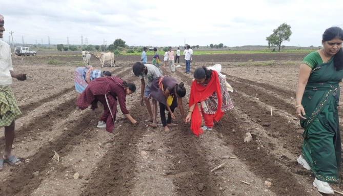 After the meeting, PSB samples were given to farmers. PSB usage was demonstrated in farmer’s field. Rasi Cotton hybrid 665 was mixed with PSB powder. It was ensured that PSB inoculation was proper with the seed.Cotton hybrid Rasi 665 which was inoculated was taken up for sowing in HDPS method in one acre farm belonging to the farmer Sri.Kondaiah. 90x15cm spacing was followed. As ample amount of rainfall was received in the last two days. Sowing was taken up on 24.06.2023 Farmers, staff were involved in HDPS demonstration to the satisfaction of all the villagers.